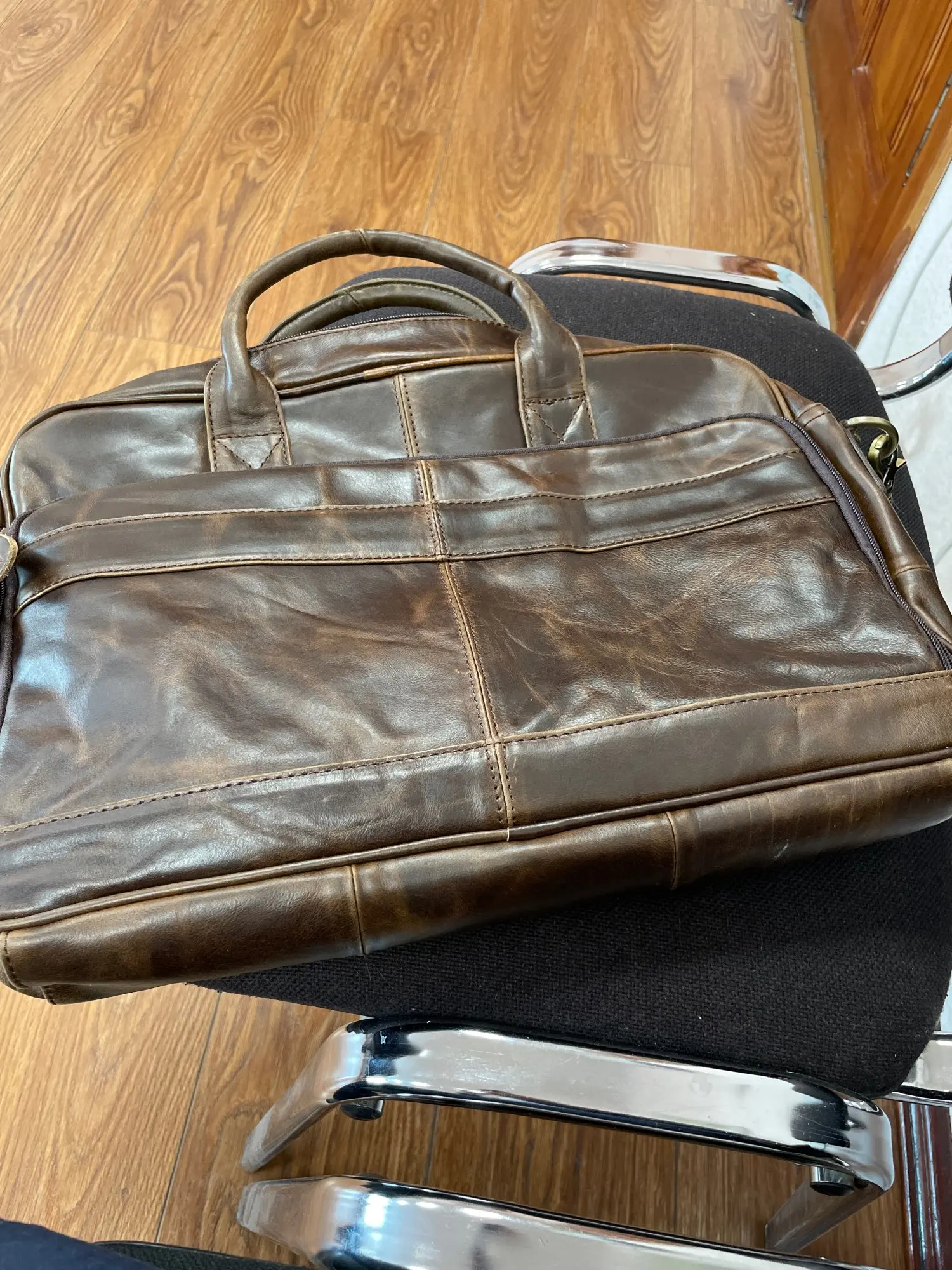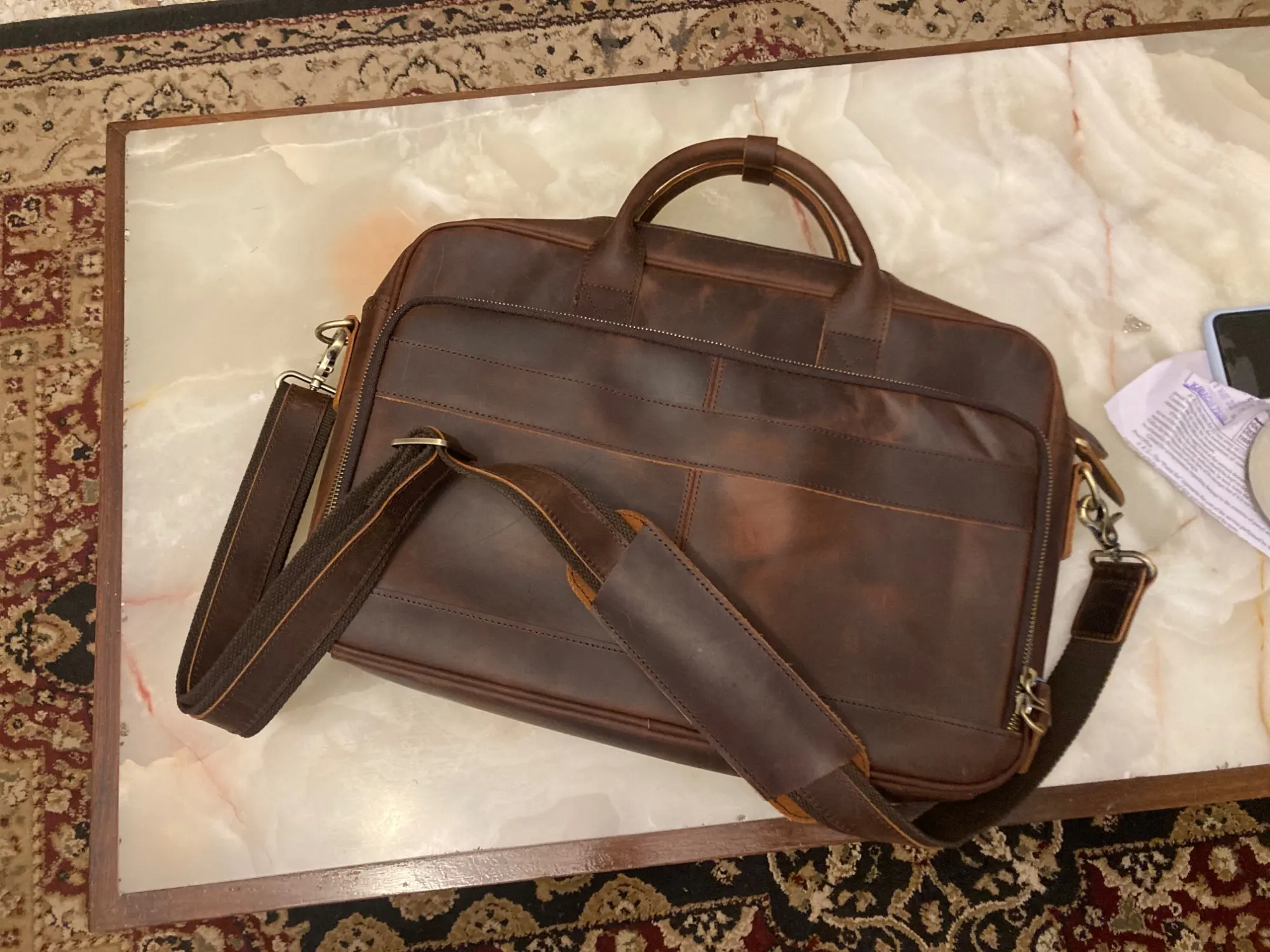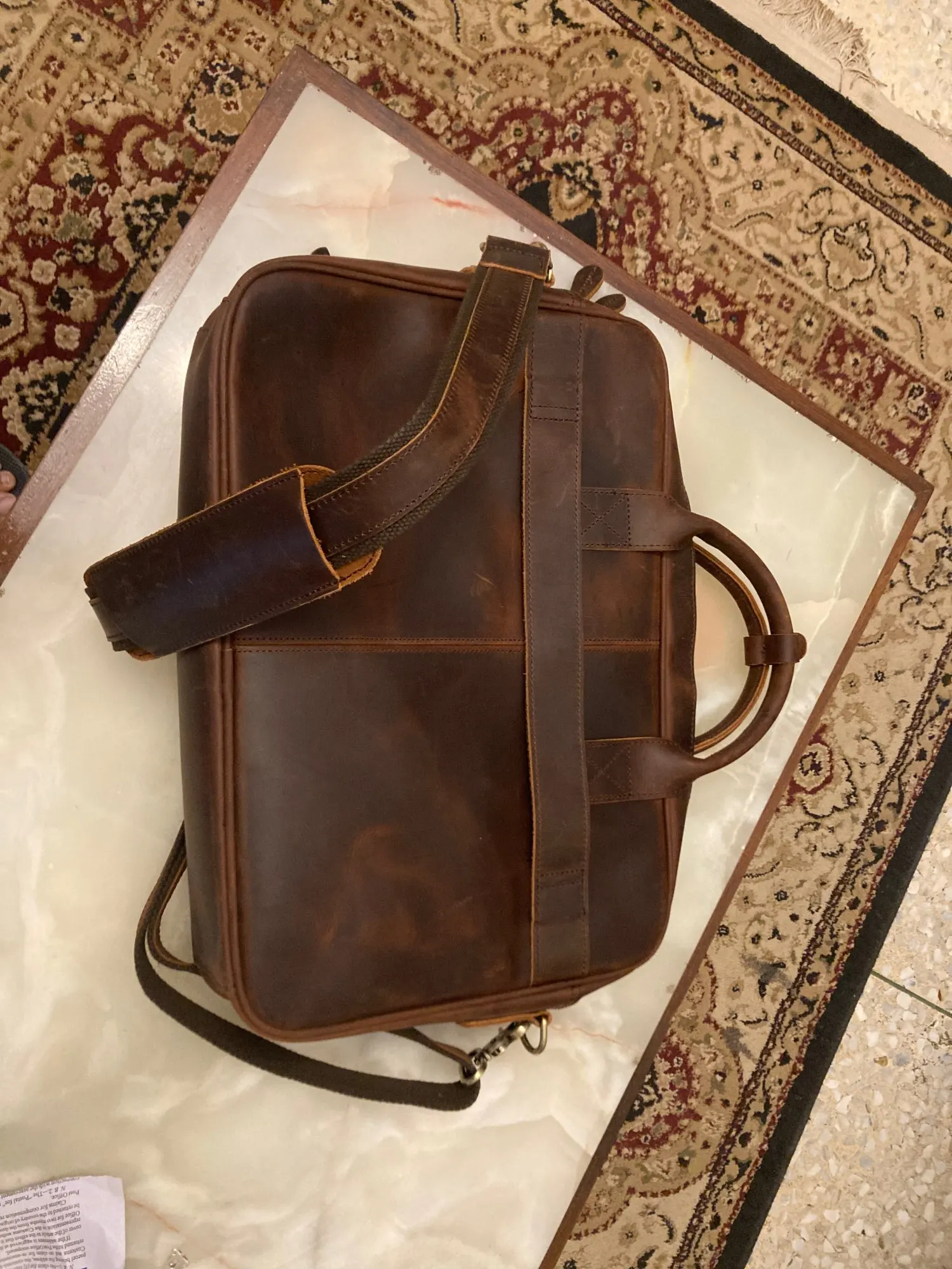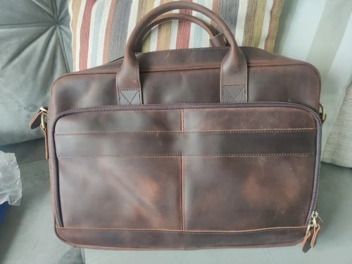 El producto es tal como lo ofrecen y tal como se ve en las fotografías. Quizá varía levemente en el tono del color del cuero, pero es algo menor. Me sorprendió la rapidez con la que llegó, estoy en Chile y el producto llegó en menos de 15 días y en perfecto estado. Muy buen vendedor. Lo recomiendo 100%