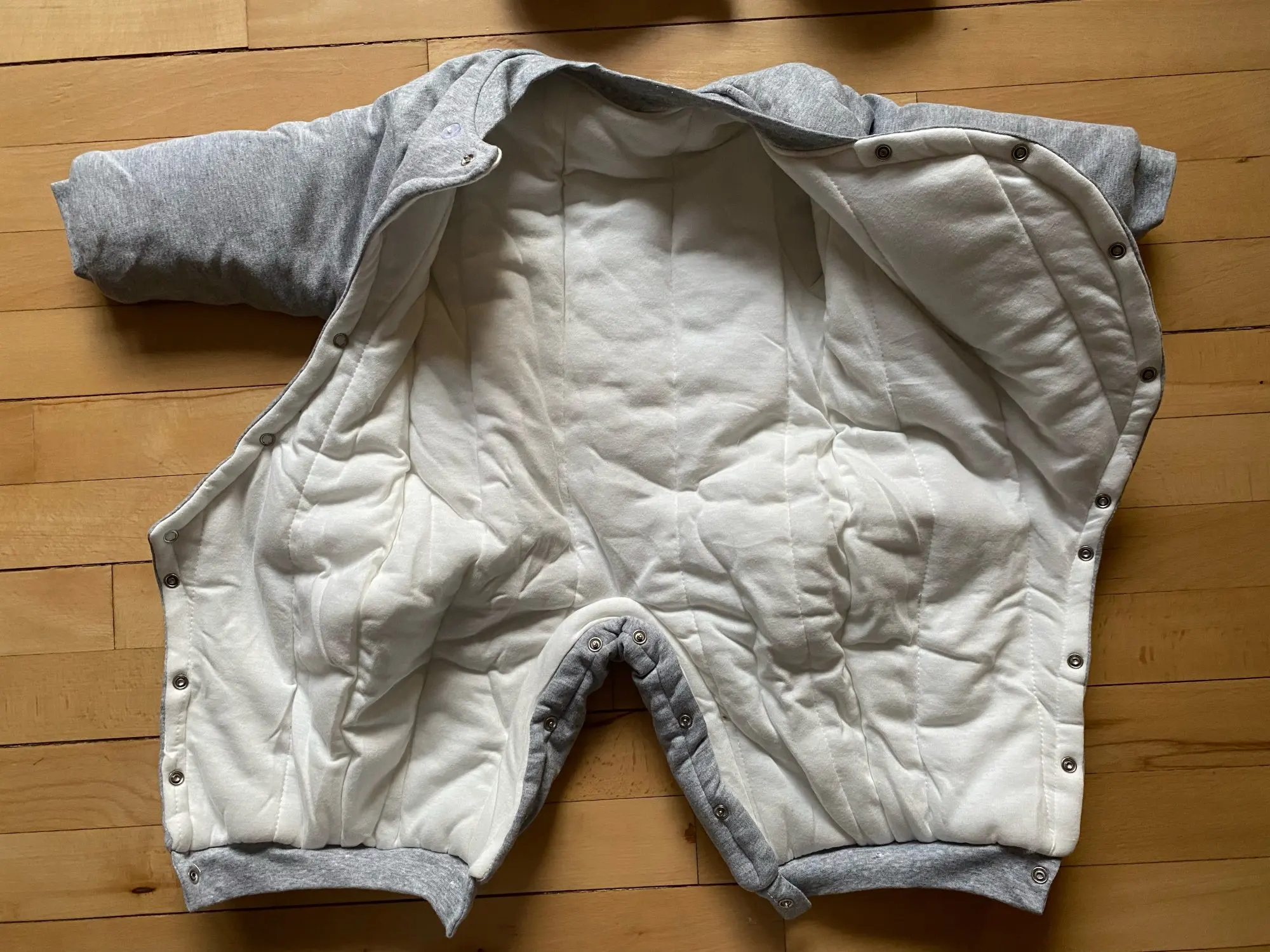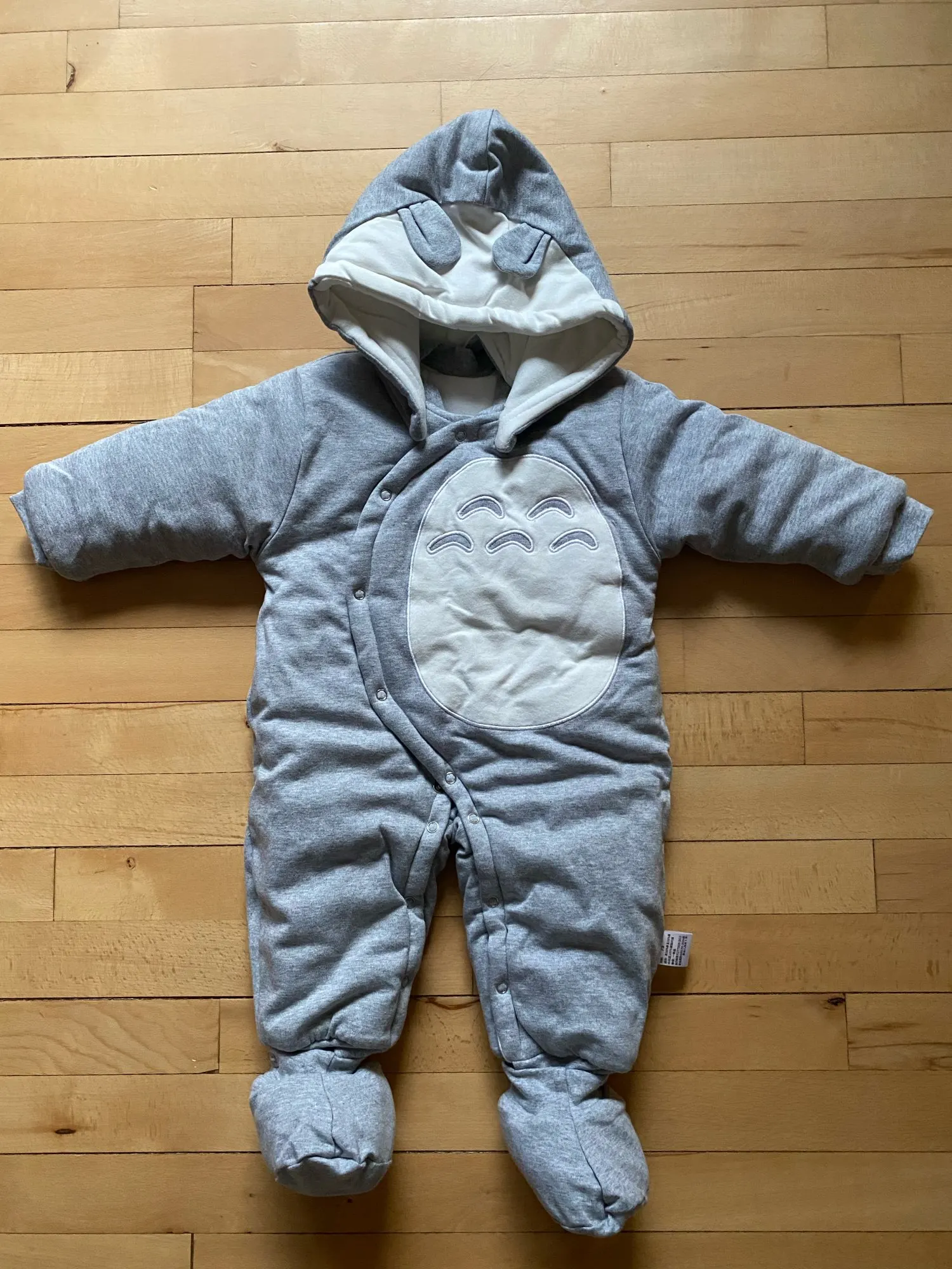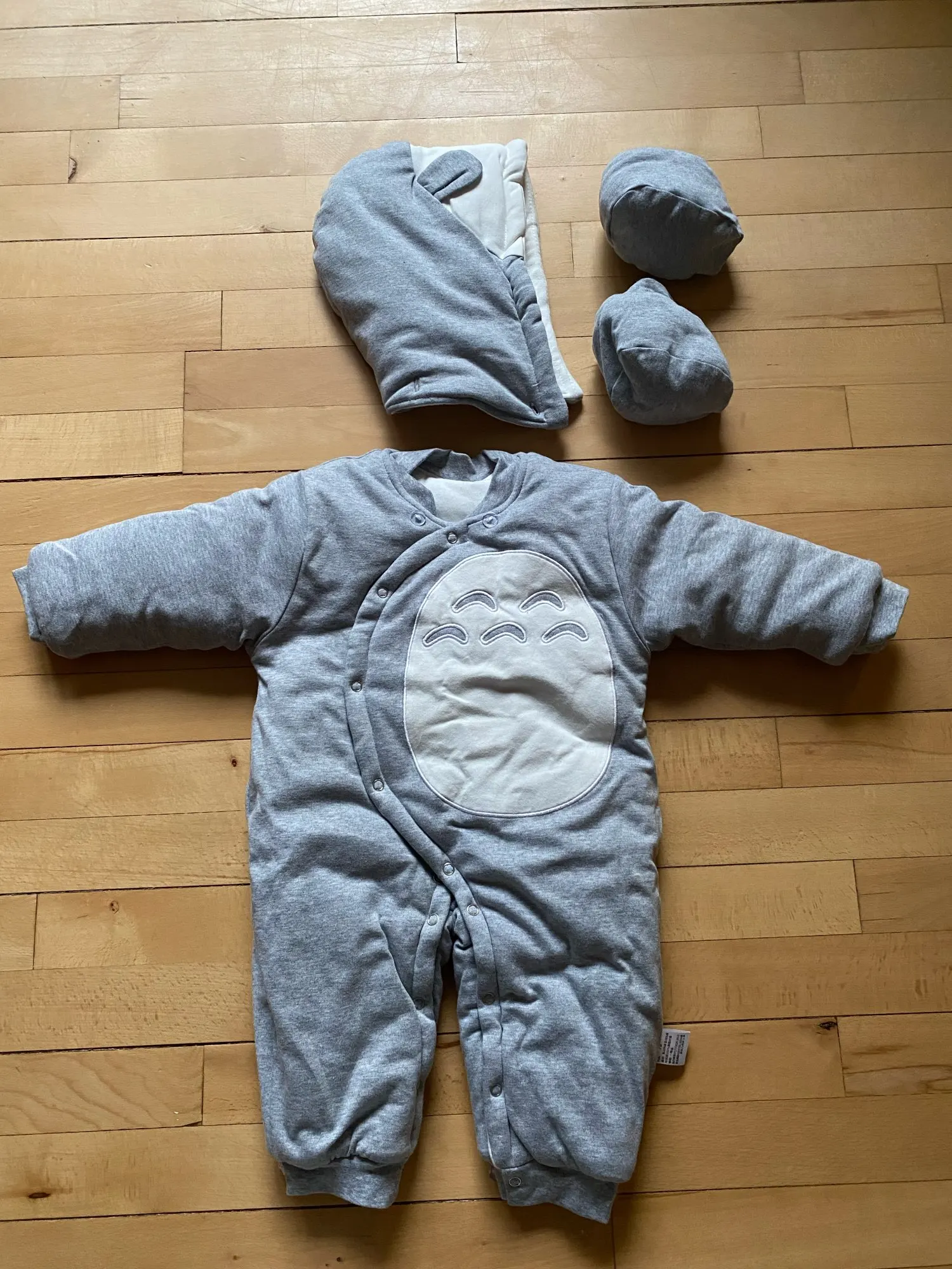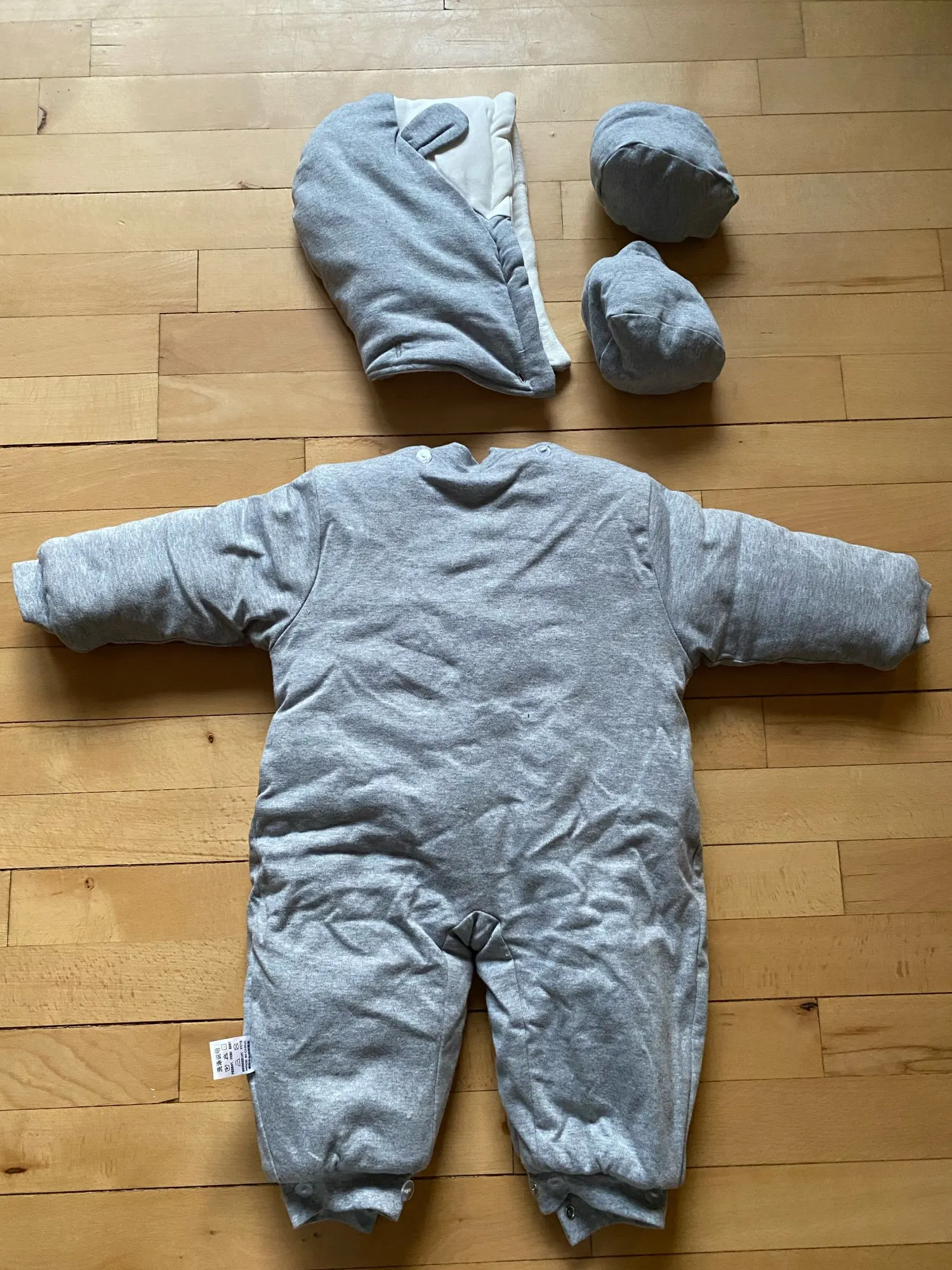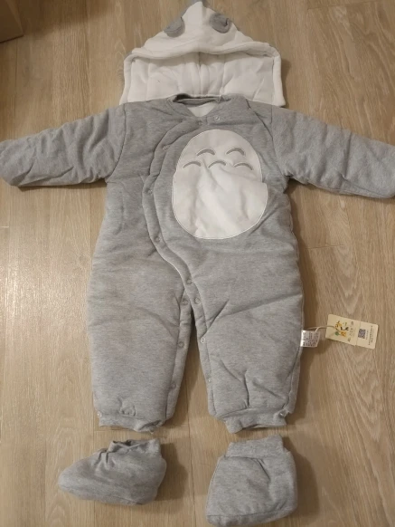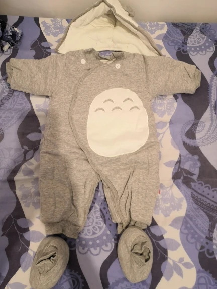 muy bonito talla bastante grande consta de gorro pero y dos patucos a juego, el envío a sido rápido. muy recomendable.
