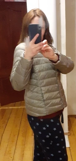 La composición es delgada , abriga , buena calidad Mis medidas son 94-75 90, es corta y queda bien ajustada , si desea poner sweater bajo debe pedir L. Es mas delgada y con menos relleno que las parkas y los sin mangas de este vendedor.