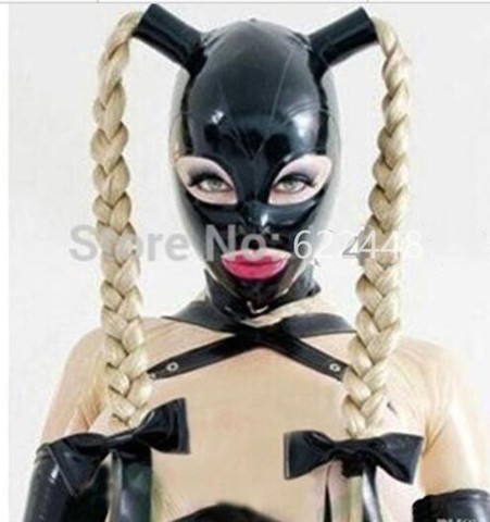 Máscara de látex para 100%, capucha de goma con coletas, máscara de fetiche, dos pelucas trenzadas, sombrero del látex personalizado