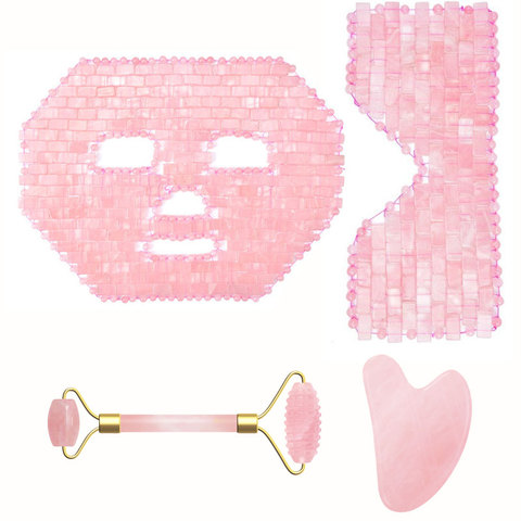 Mascarilla de cuarzo rosa de Jade, rodillo para masaje Facial, tablero Guasha, rascador Gouache, piedra Natural, terapia fría, masajeador Facial