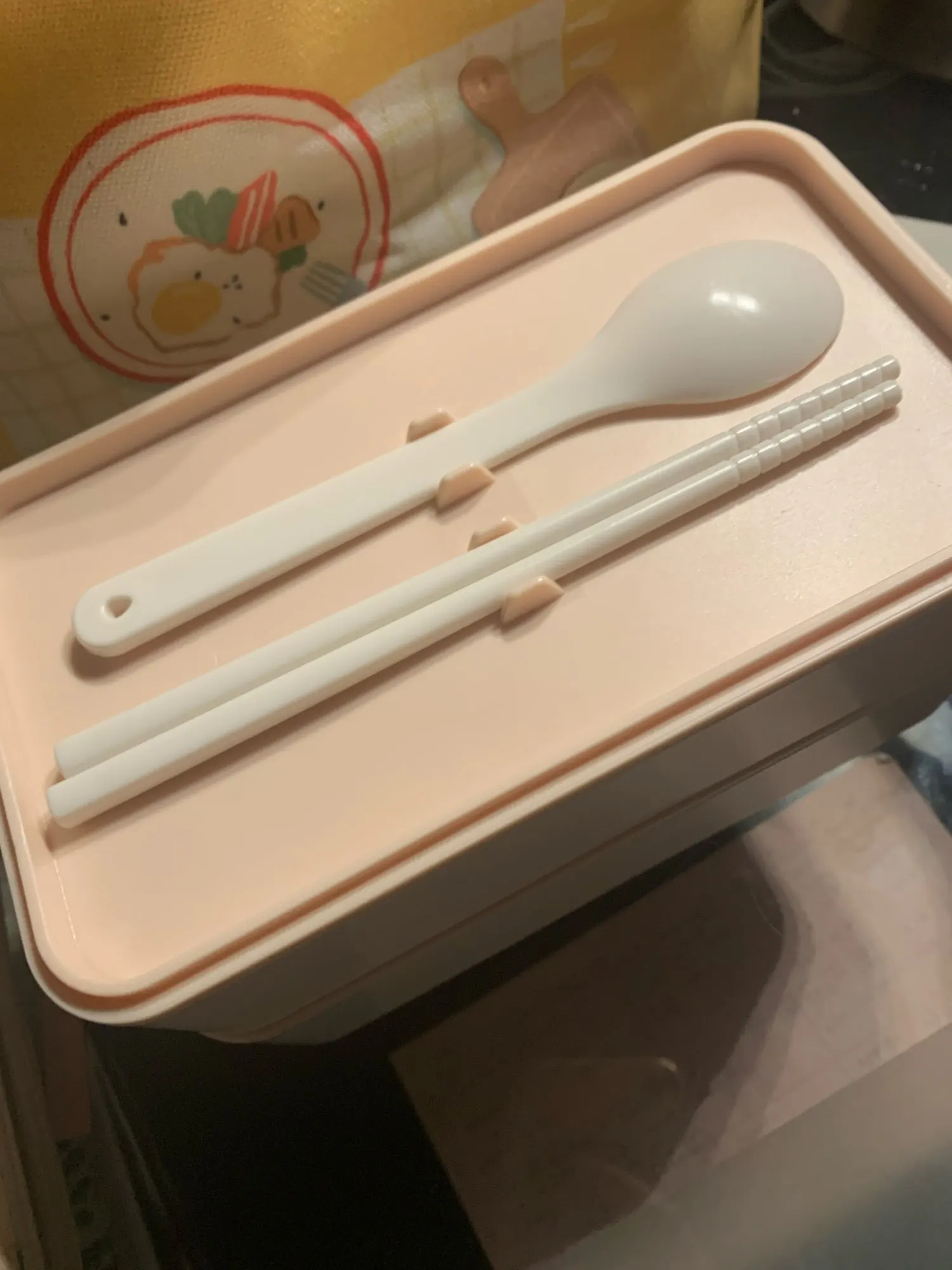 Me gusta mucho el diseño y el material. Pero los palillos y la cuchara que vienen no se mantienen quietas, se quedan sueltas dentro de la cajita. Por lo demás perfecto.