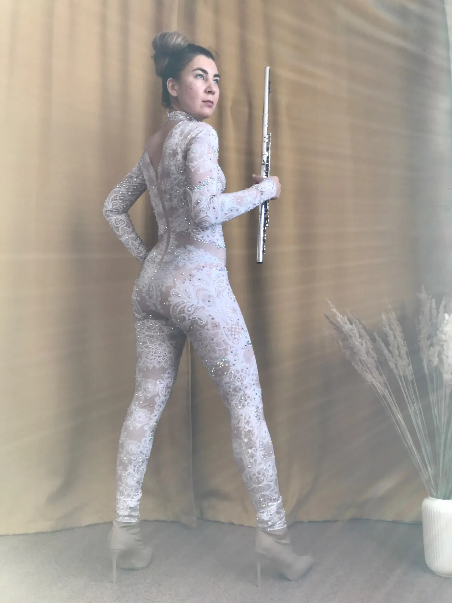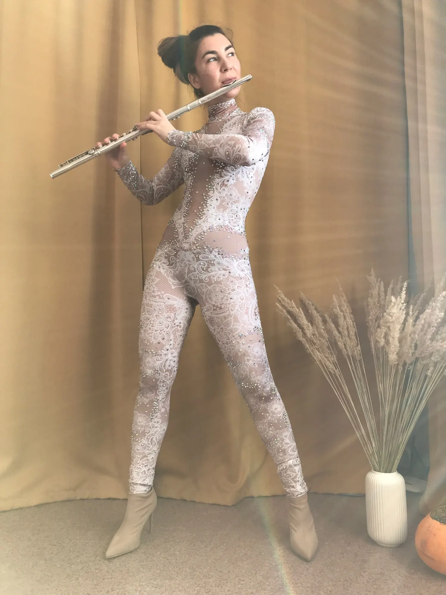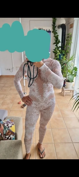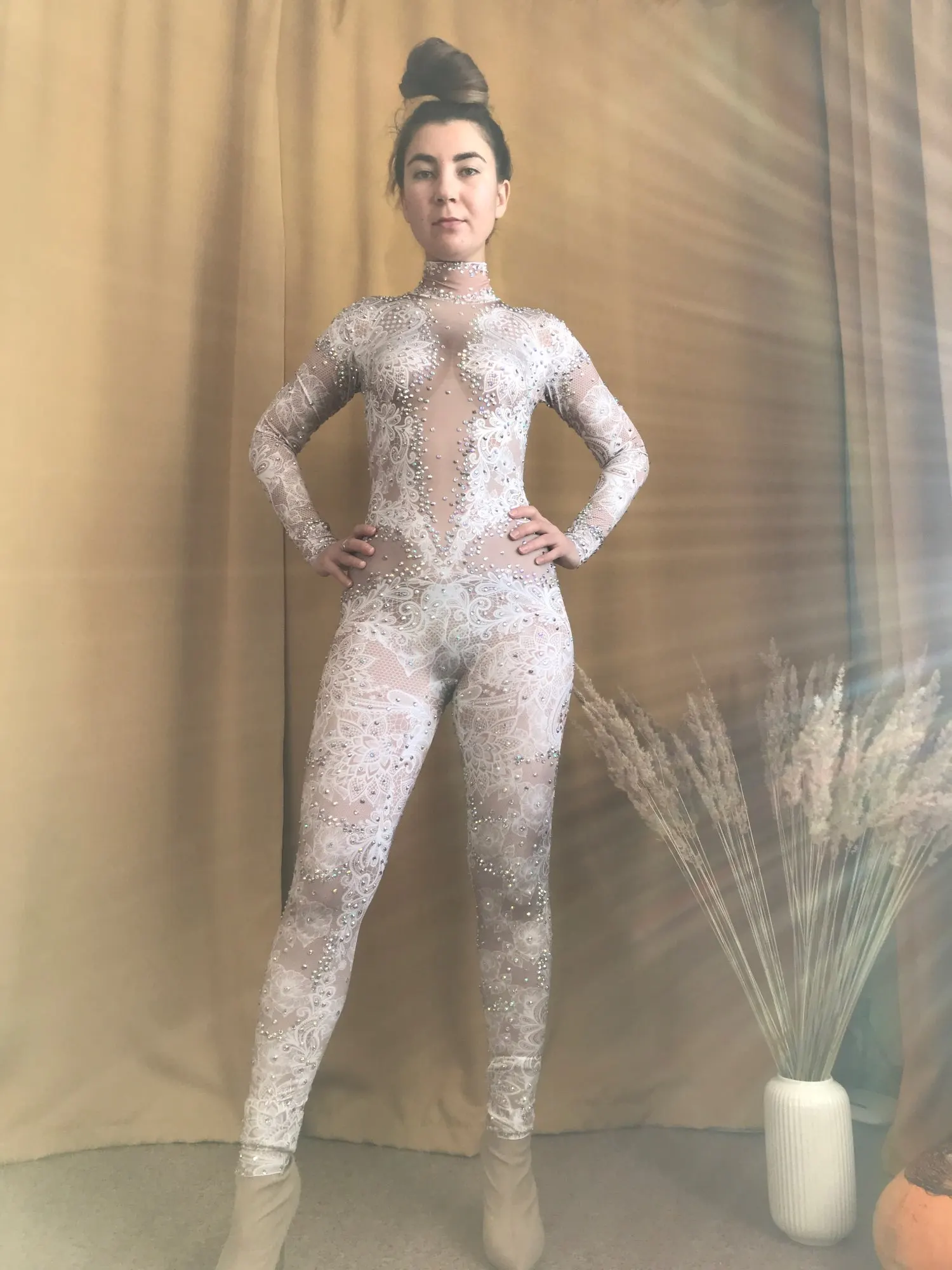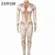 Mono de LICRA de encaje estampado blanco para mujer, Leggings de diamantes de imitación, traje de una pieza para escenario, club nocturno, mono de baile