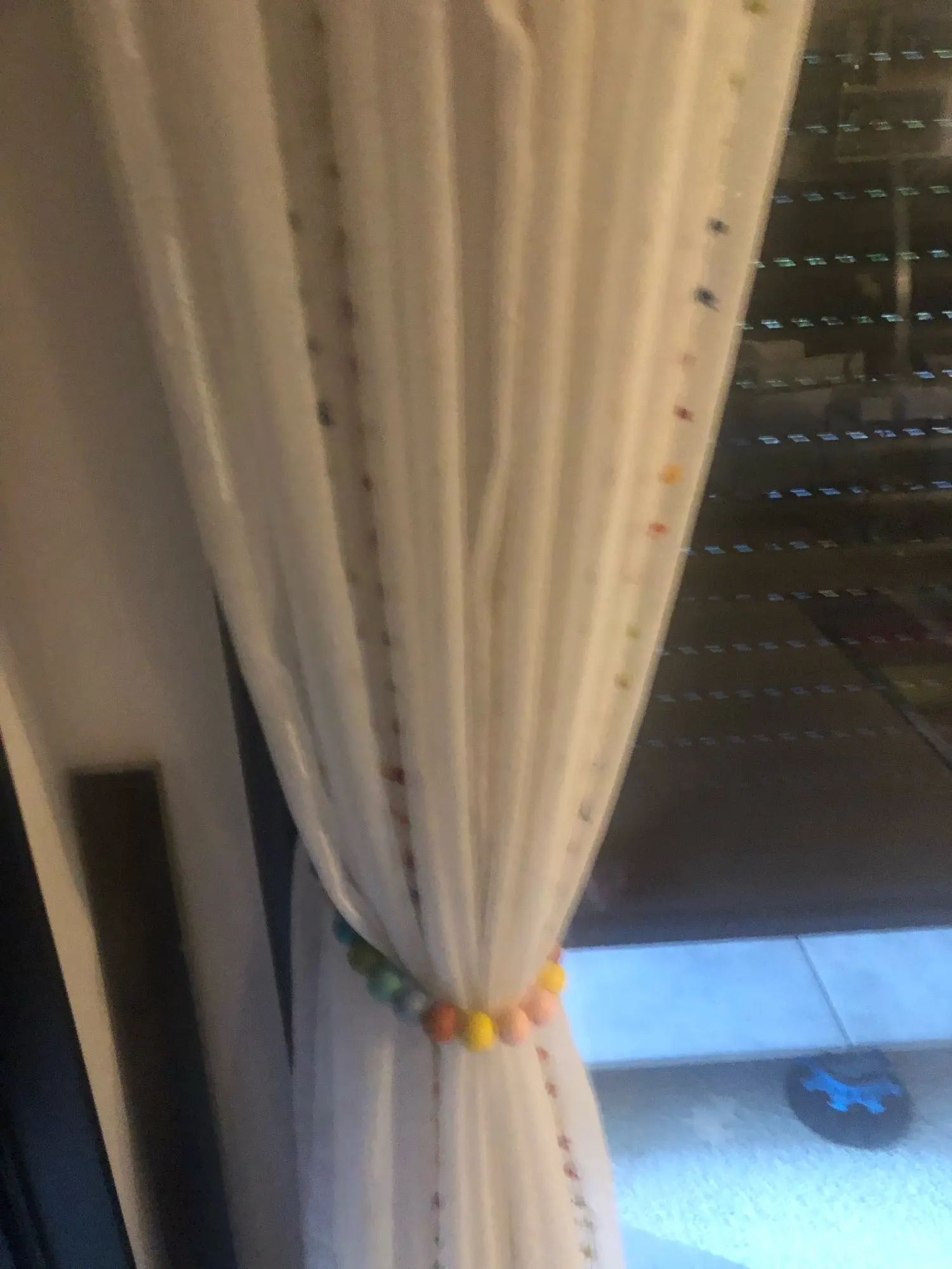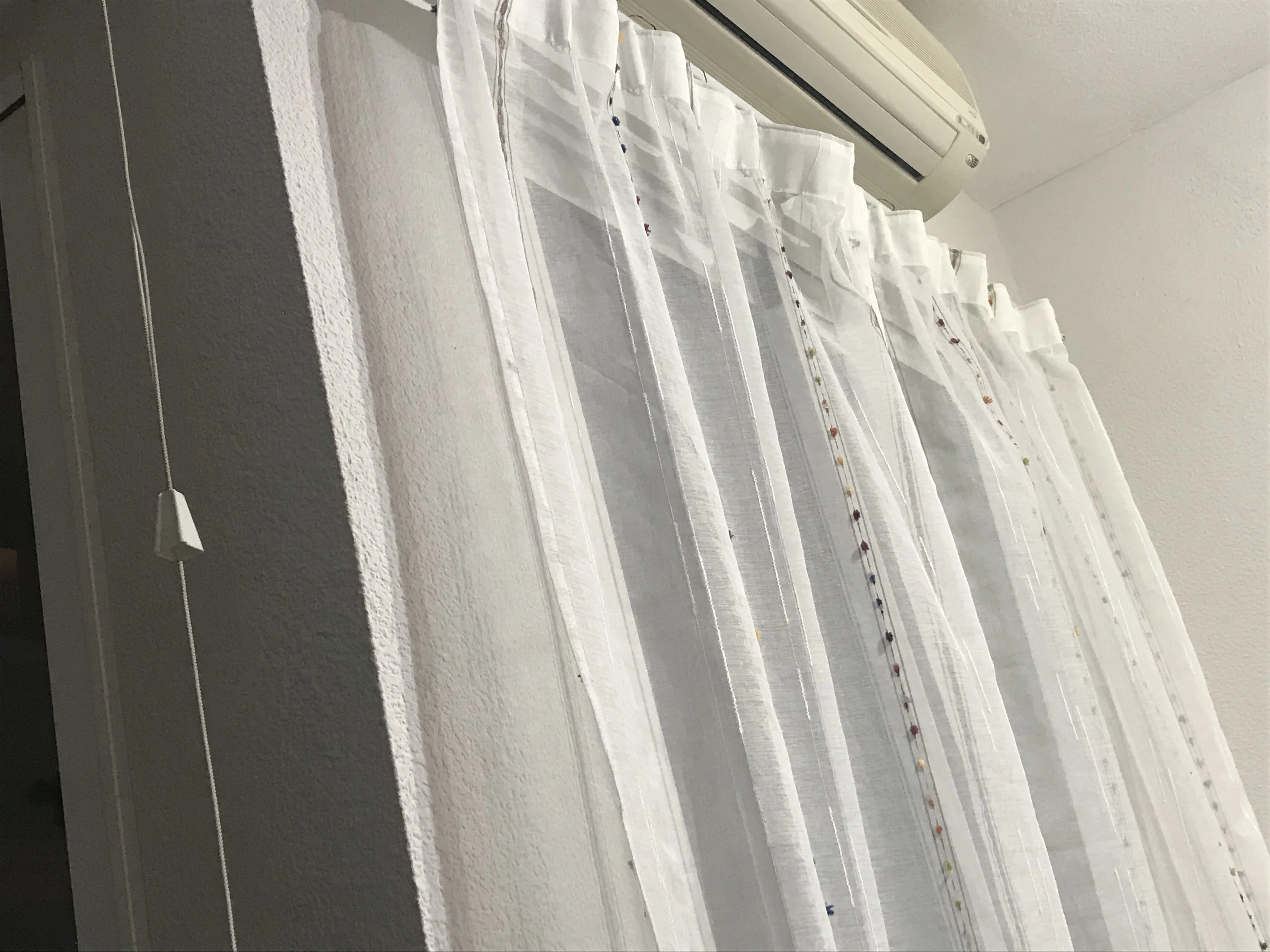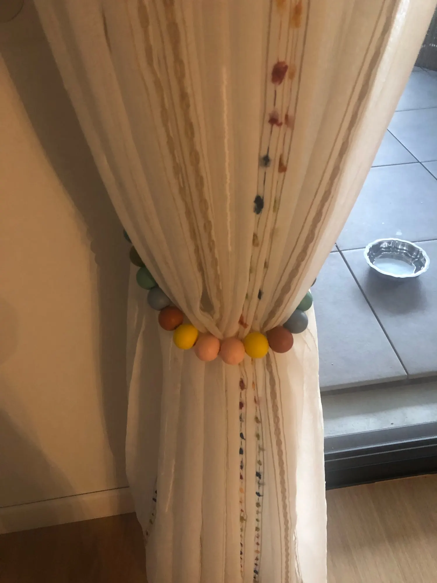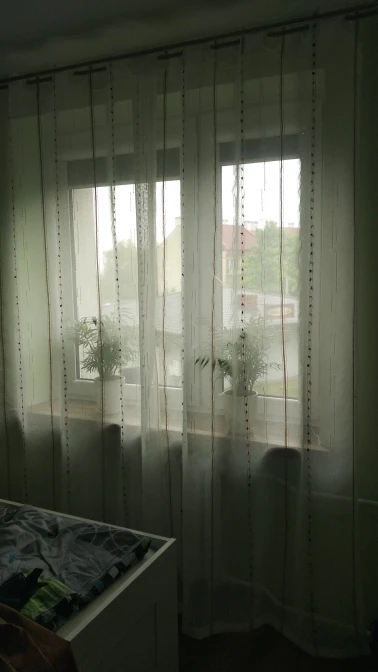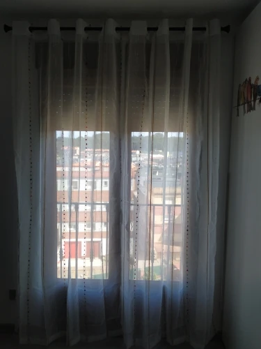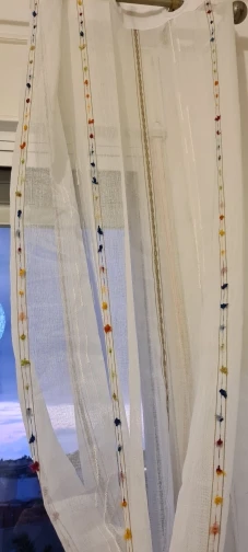 Las cortinas son preciosas, el tamaño y descripción tal y como pone pero las mías huelen regular después de dos lavados. Las cositas muy bien también aunque venían algunos hilos sin cortar, pero bien rematado.