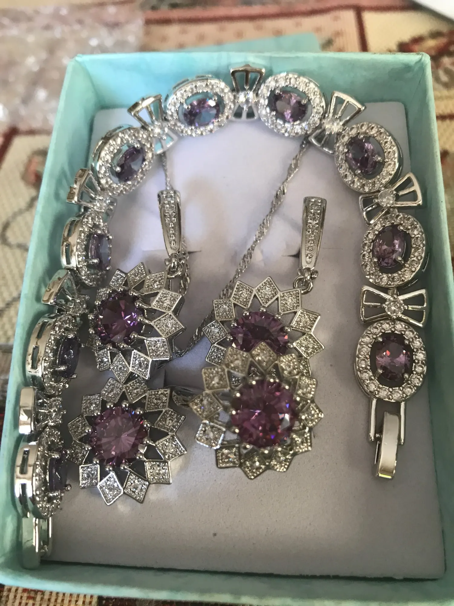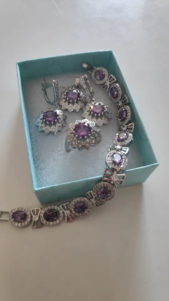Noble púrpura Cubic Zirconia de Color de plata conjuntos de joyas para las mujeres flor en forma de pendiente colgante collar anillo y brazalete