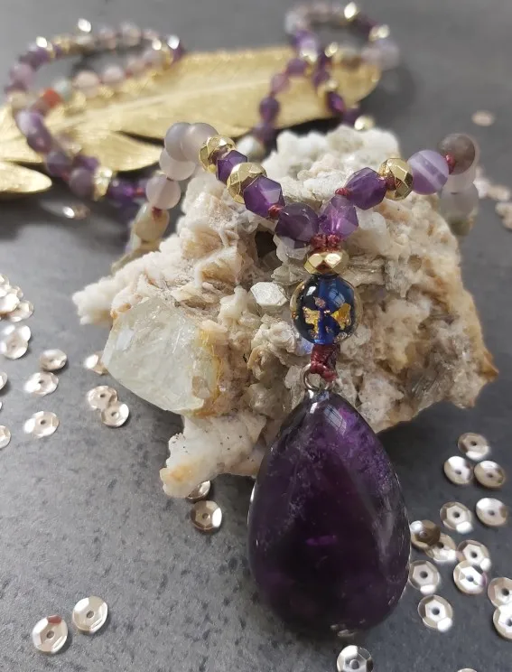 Nueva calidad de piedras naturales collar con dije en forma de gota mujeres amatistas étnico cuentas Lariat collar de joyería venta al por mayor