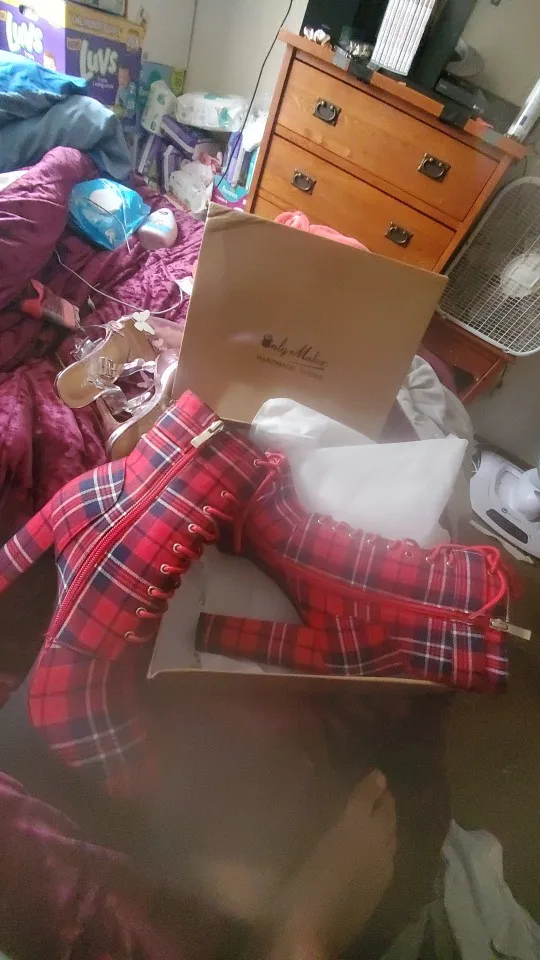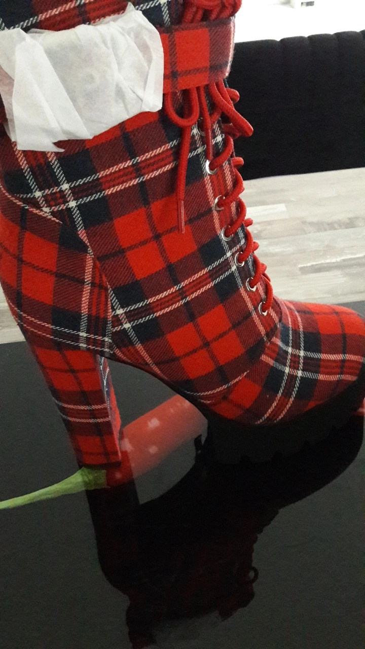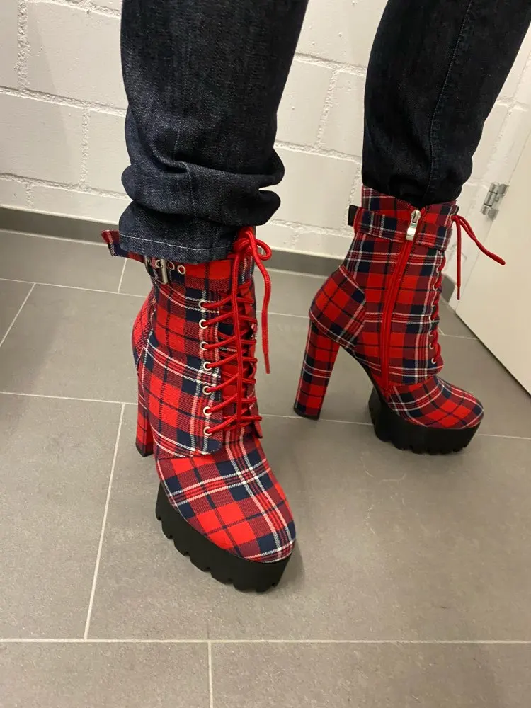Onlymaker-Botines con plataforma para mujer, botas con hebilla, tacón grueso, color rojo, a cuadros, con cordones, cremallera lateral, punta redonda, para invierno