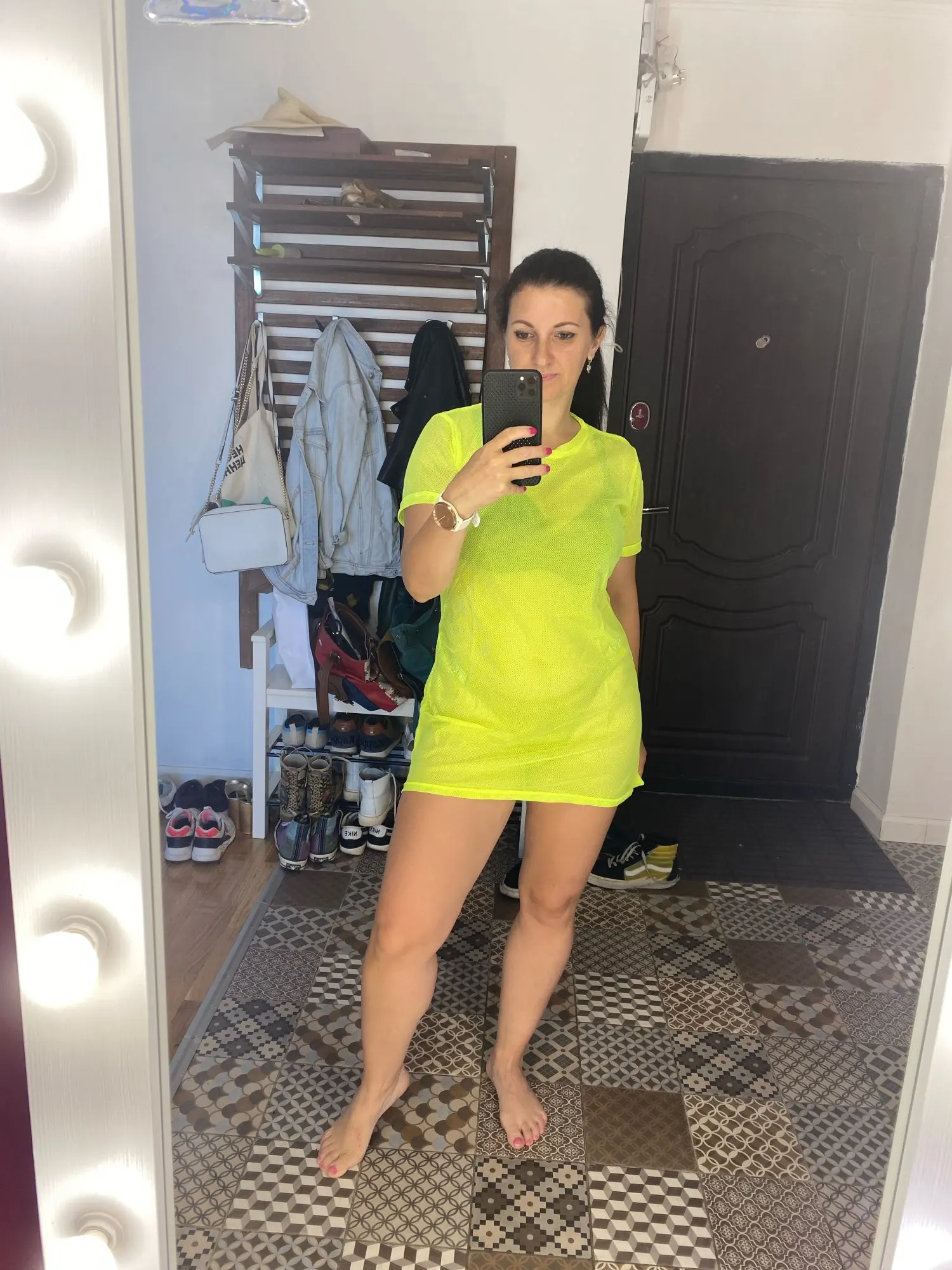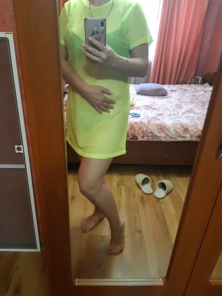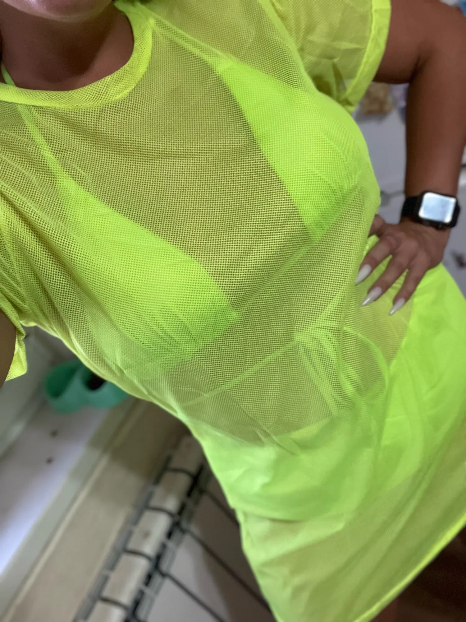 Perspectiva de manga corta Camiseta de las mujeres verde neón O cuello Vintage de malla de manga corta Camiseta Camisetas largas playa encubrimiento