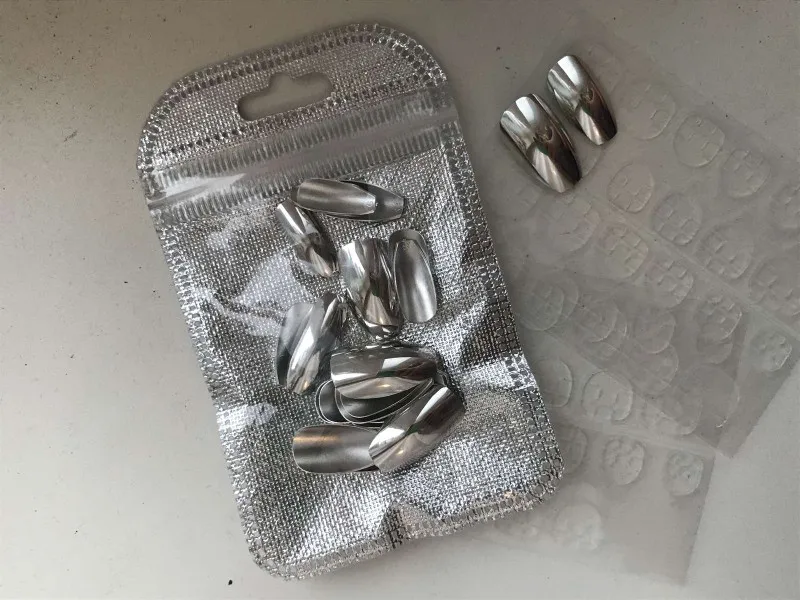 Plata brillante Artificial espejo Set de uñas ataúd en forma de uñas metálico cromo acrílico Kit de uñas con adhesivo pestañas