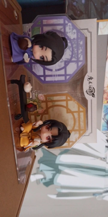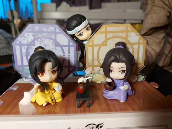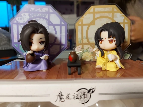 Precioso! La caja viene muy bien embalada y protegida, no sufrió ningún daño en el transporte. Las figuritas son preciosas y tienen unos detalles finísimos! No se ve bien en la foto, pero la ropa tiene muchos pliegues, y el pelo tiene mechones marcados. Al lazo que ata la túnica de Jin Ling no le falta detalle! Aún así, tienen algún pequeño defecto de fábrica... pero por lo general, están genial. Y adoro la caja!