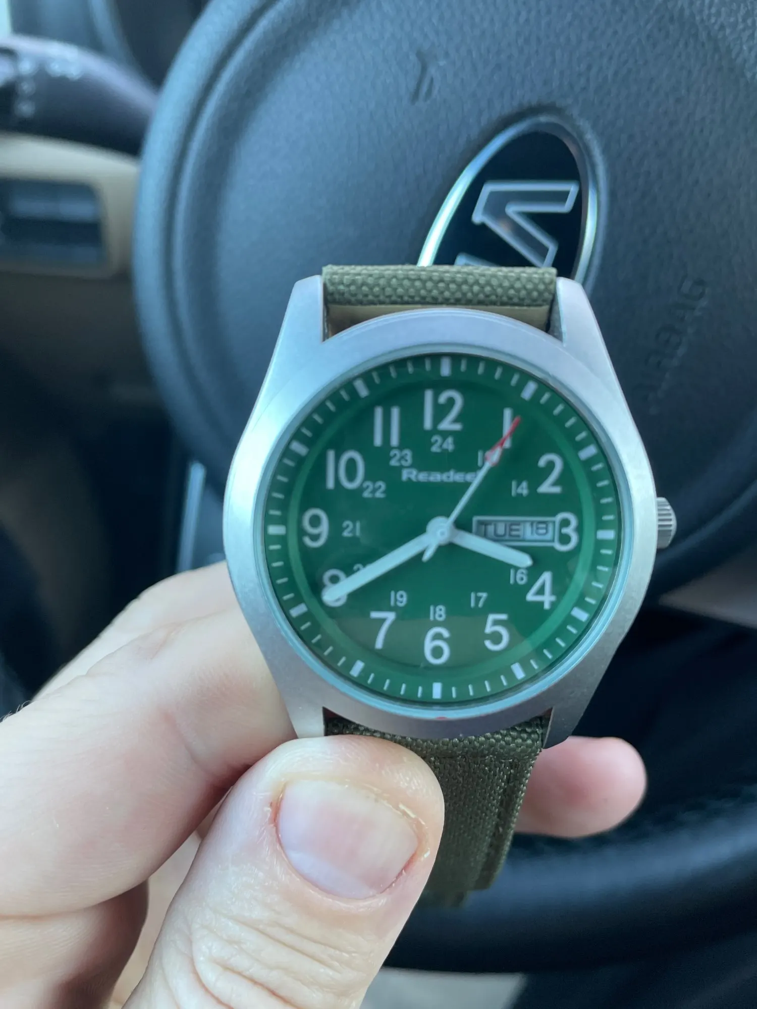 Muy buen reloj por el precio. Buenos detalles y estupenda legibilidad. De momento mantiene la hora perfectamente, así como el día y número del mes. Sobre la correa, ninguna queja; la verdad es que por 9€ no se puede pedir más. Totalmente recomendable!!