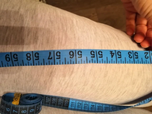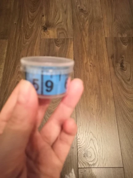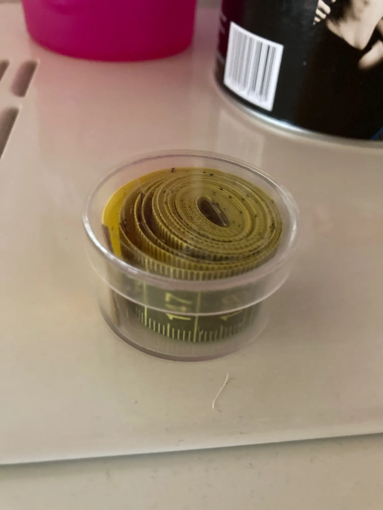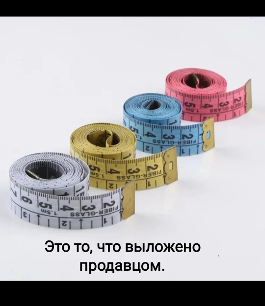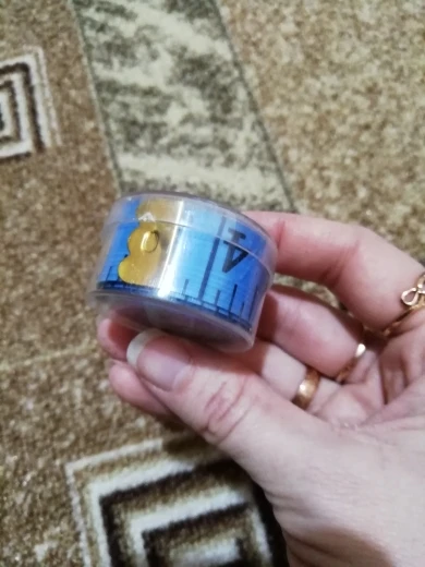 esta muy chula, viene en una cajita cerrada y el material es tela muy comoda de manejar, por un lado cms y por otra pulgadas, la mia es rosa y es muy bonita.