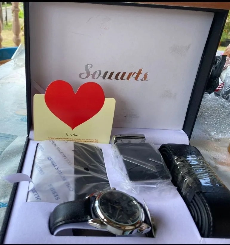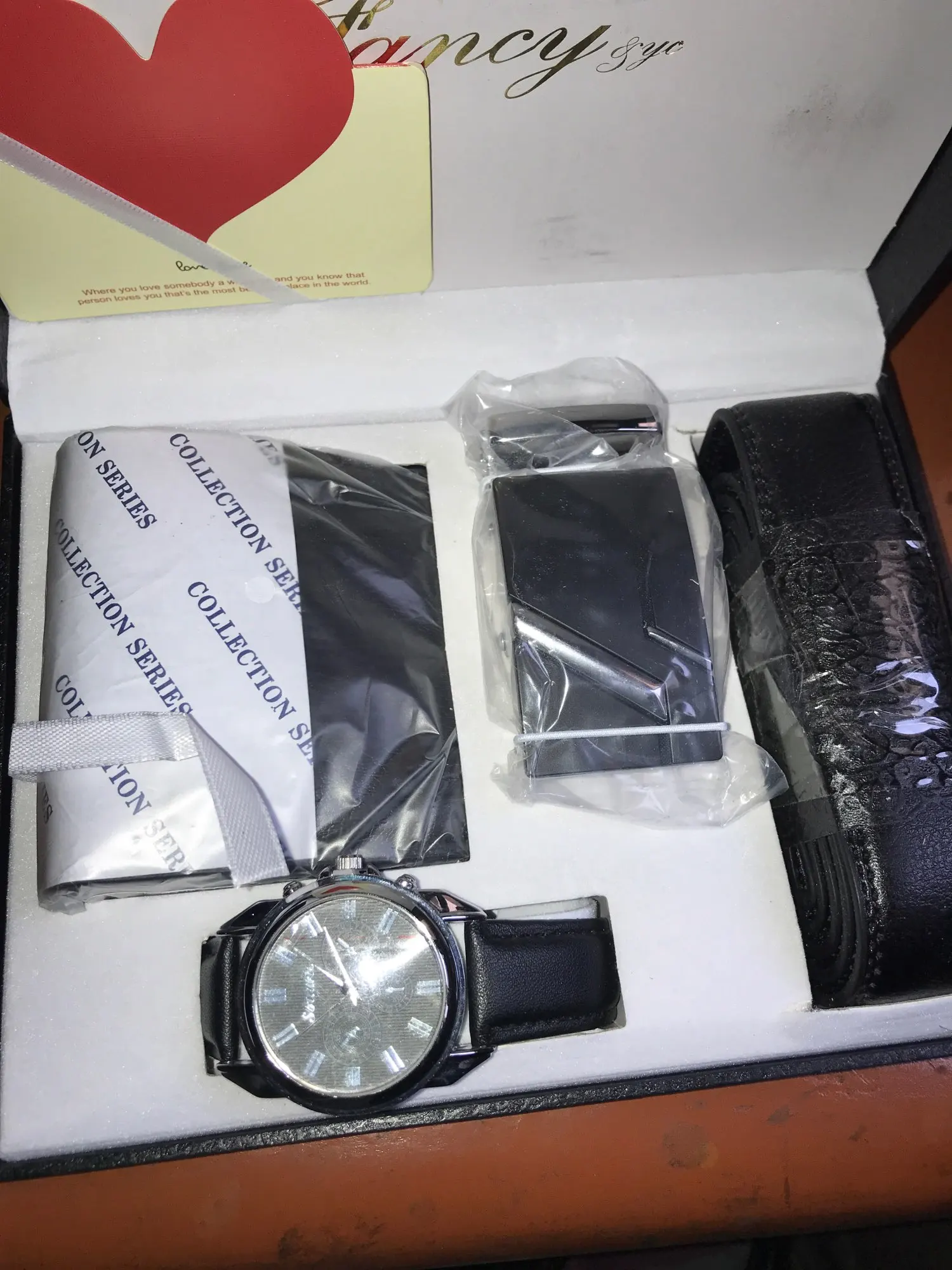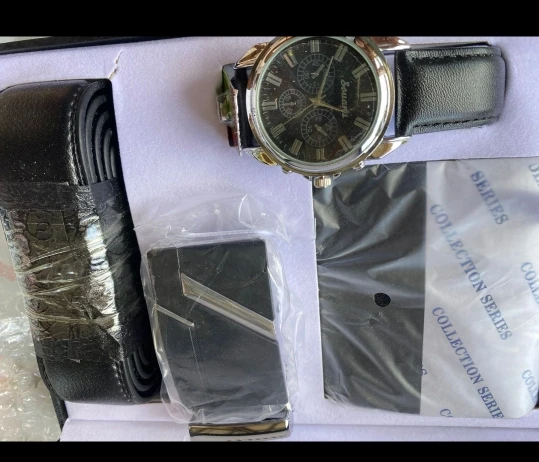 esta bien único la cremallera de monedero se estropero enseguida reloj y cinturón igual que en la imagen.
