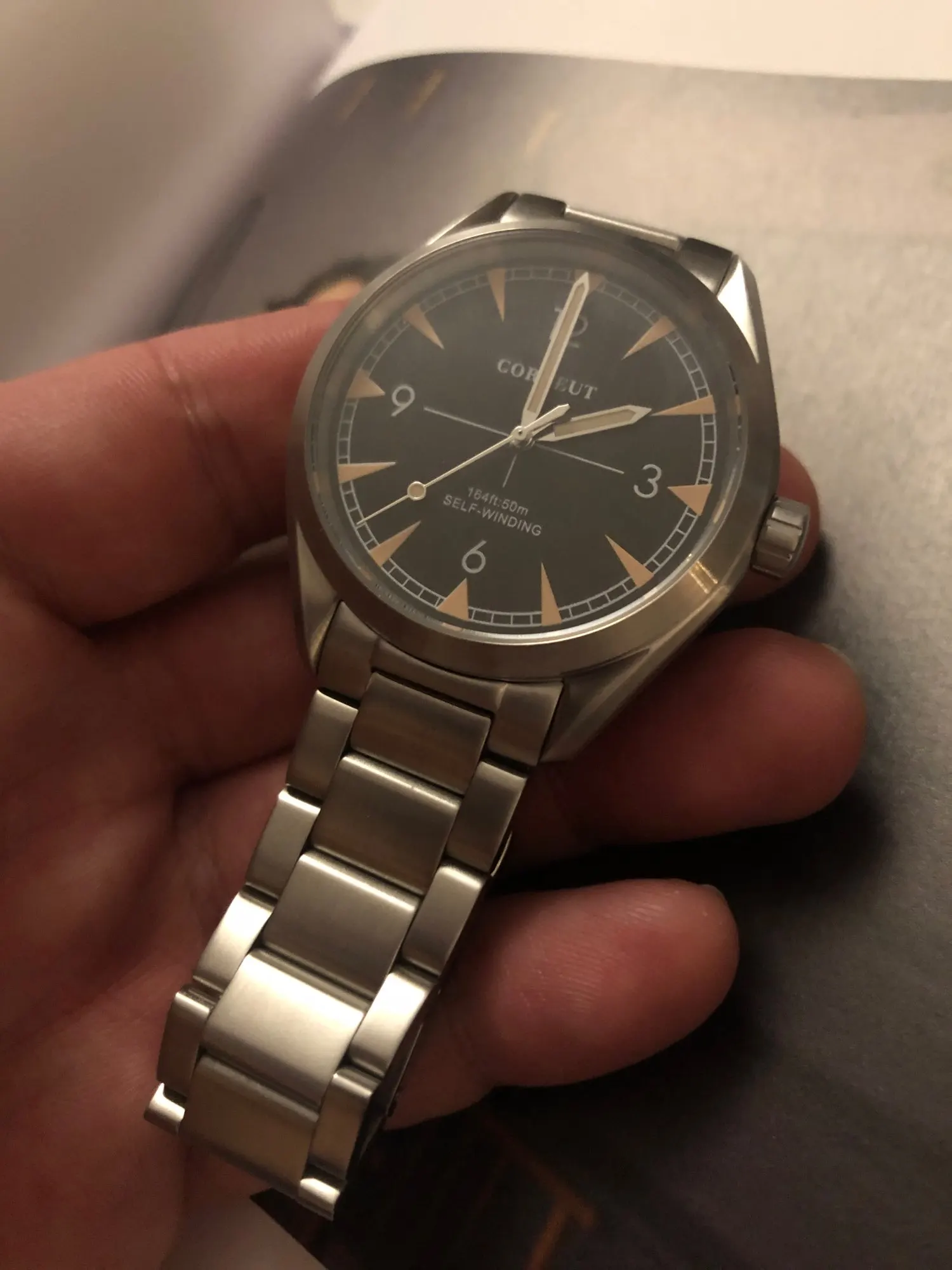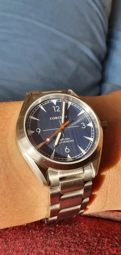 Bonito reloj. El acabado es bueno. Bajo la lupa se notan detalles menores, por el precio no me puedo quejar, es una buena compra. Tengo muñecas angostas (152mm) y el tamaño (41 diámetro x 48,7 de largo aproximadamente) es quizá lo más grande con que me sienta cómodo utilizando.