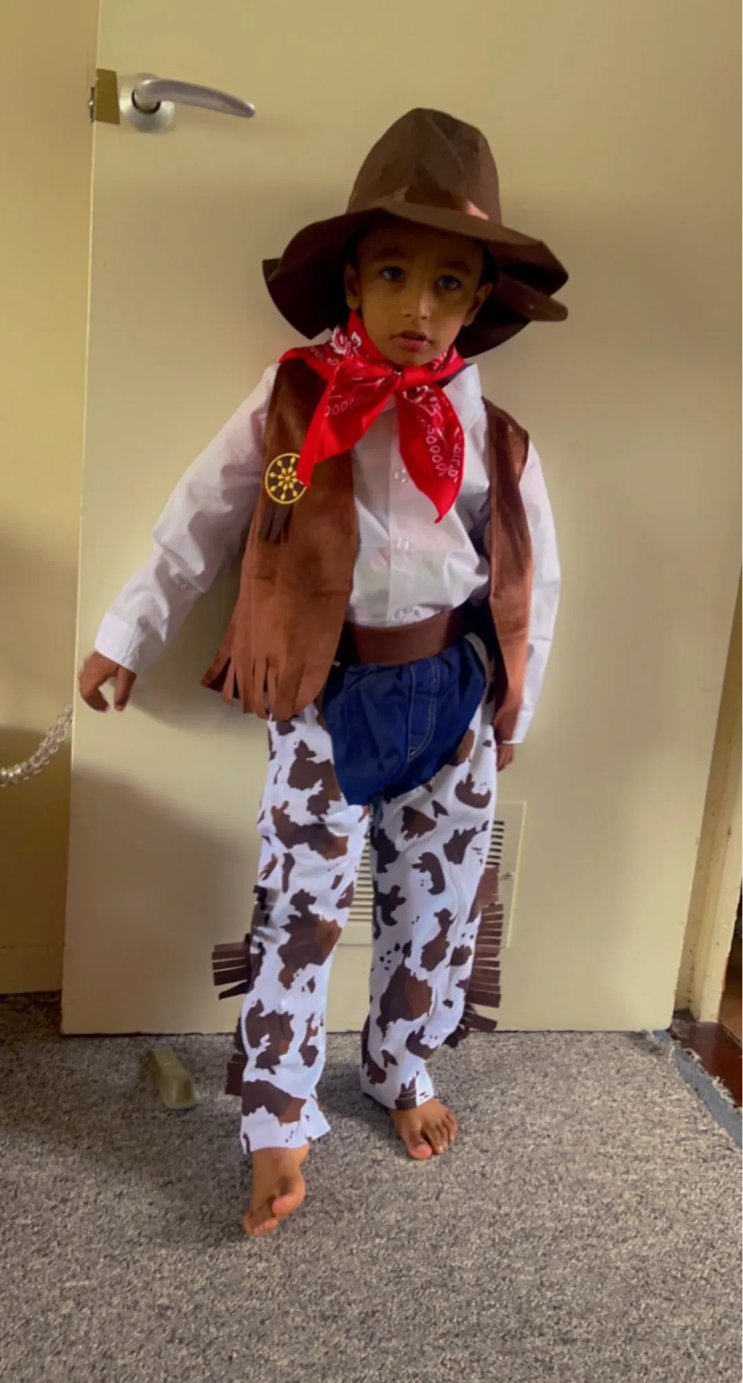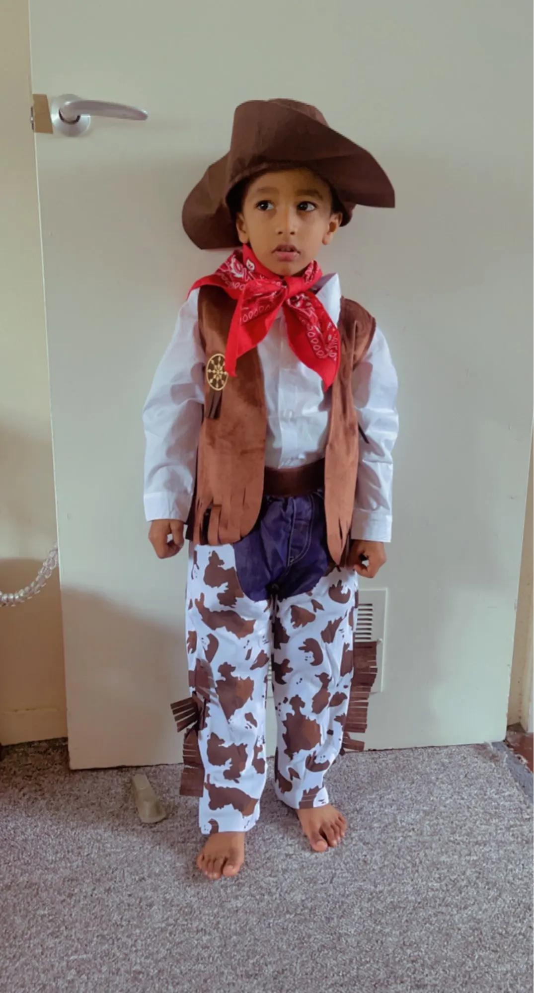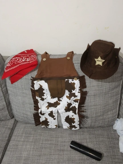 La tela es buena, pensaba que iba a ser mas finita pero esta muy bien. Los flecos de los lados son de fieltro. La talla perfecta y el pañuelo igual, lo unico q venia peor es el sombrero pero porque es de fieltro fino y al venir en el paquete se queda chafado (nada que no se arregle con la plancha)