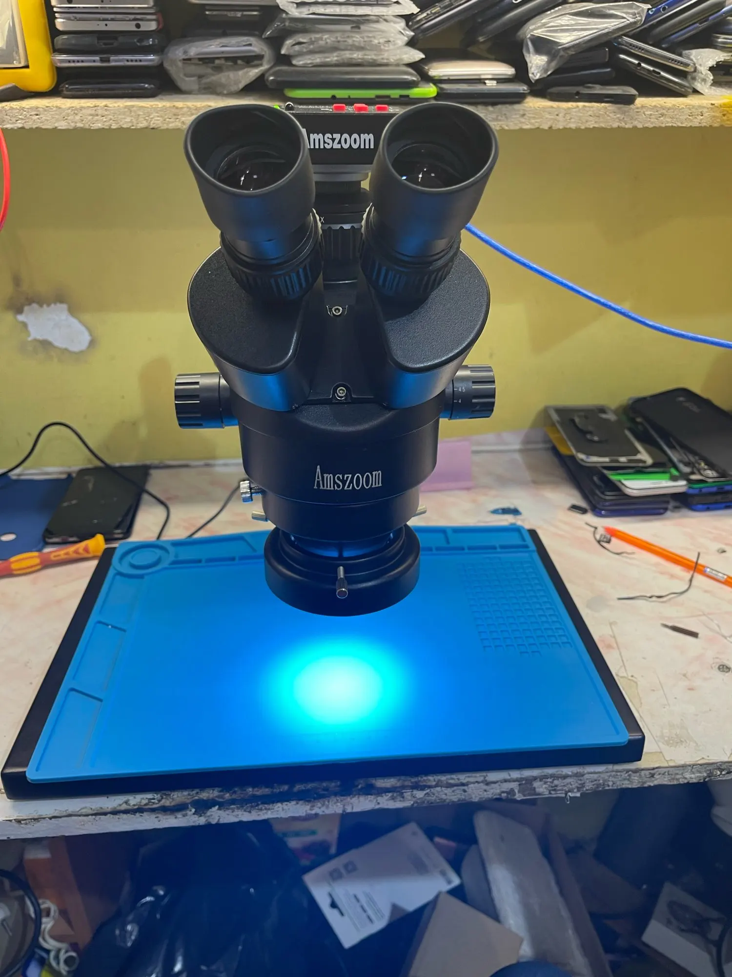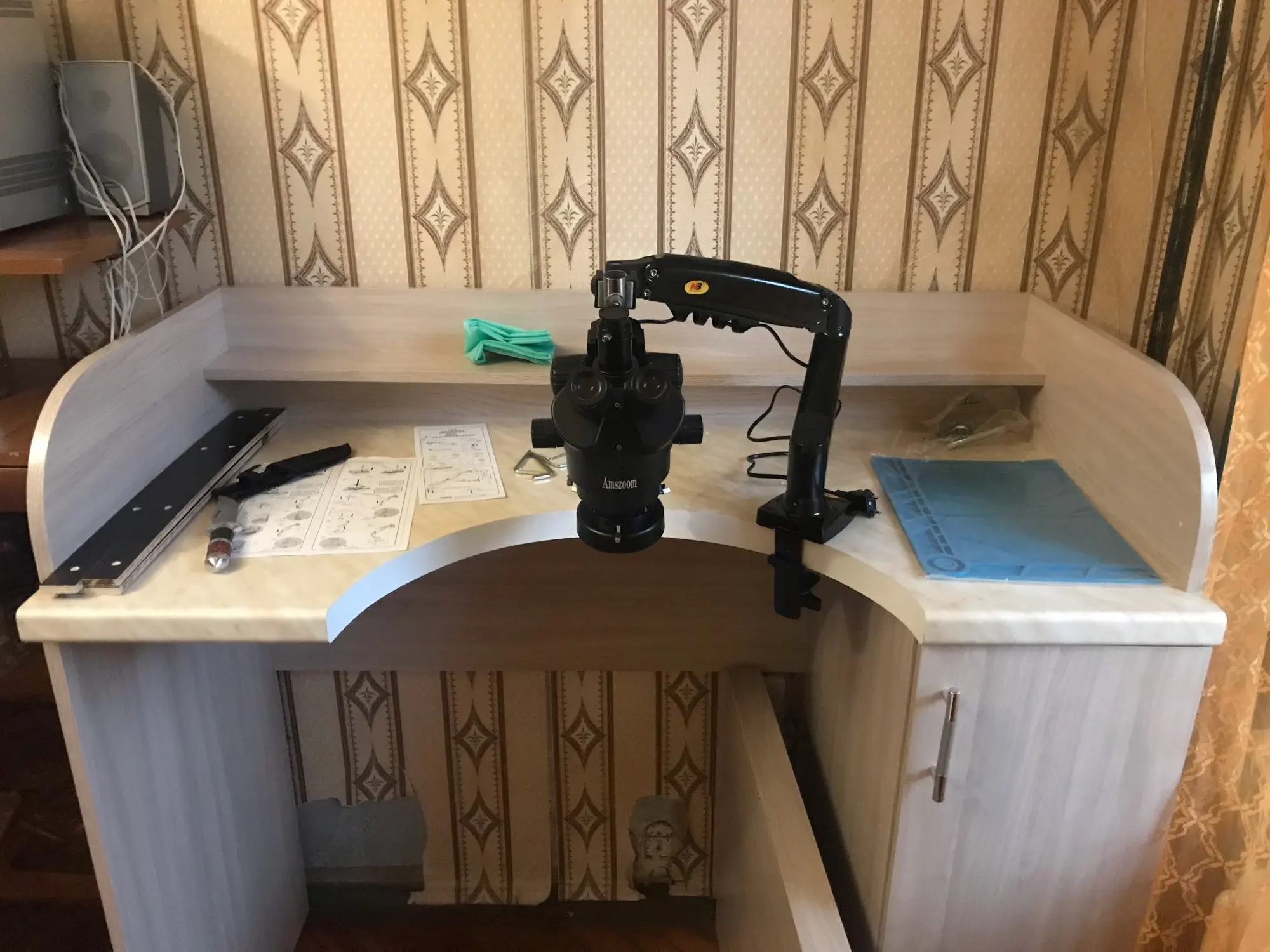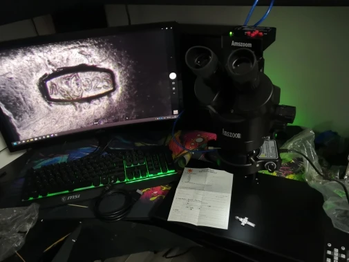 El microscopio llegó en 10 días después de que lo pedí, cabe mencionar que 3 de esos días estuvo en la aduana. Pagué 695 pesos de impuestos aquí en México. Venía muy bien empaquetado, todo protegido y ordenado. Los materiales se ven de buena calidad, se siente robusto el equipo. aquí les dejo unas fotos del microscopio armado, así como un par de imagenes usando el lente de 0.5X.