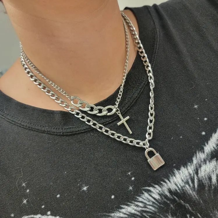 Layered Chain With Cross/Lock Pendant Necklace for Women/Men
