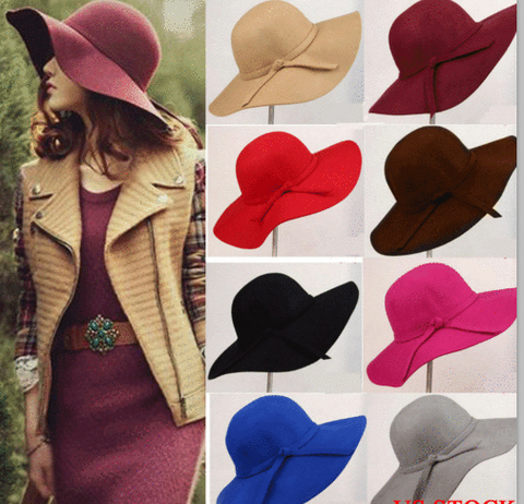 Sombrero de fieltro de lana de ala ancha para mujer, sombrero de fieltro flexible, Sombrero con lazo, Vintage
