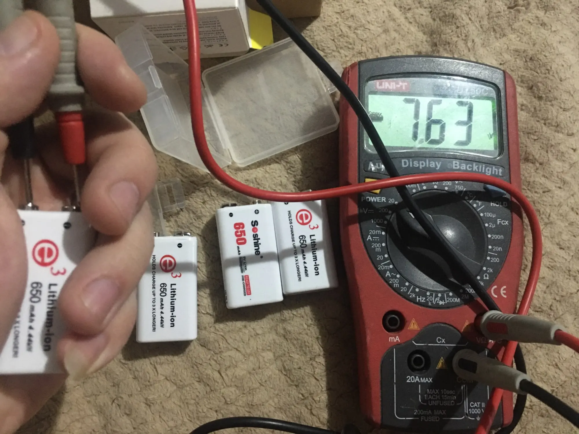la capacidad real medida es 560ma/h aproximada. 8Votios, como son 2 celulas en serie 4+2=8V que nadie crea que puede dar 9v. Si quires 9v comprar lifepo4 que se ponen en 9,6V o un poco mas casi 10V. Veremos en el futuro que tal resultado. dan