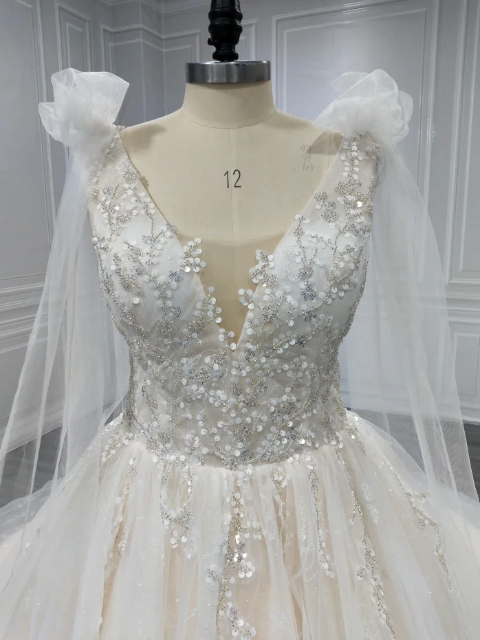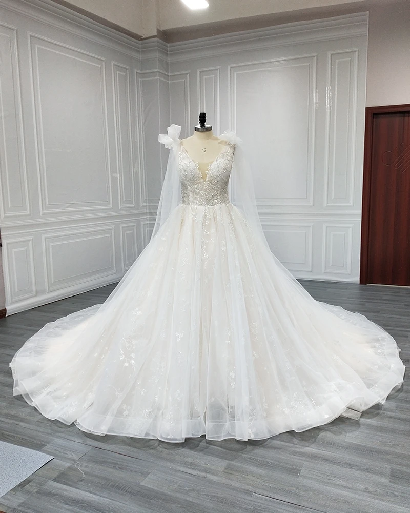 Super Gorgeous-vestido de novia con cristales, brillante, encaje con cristales, tren capilla, cuello en V, lazo, hombro, de estilo princesa vestidos de novia, 2022