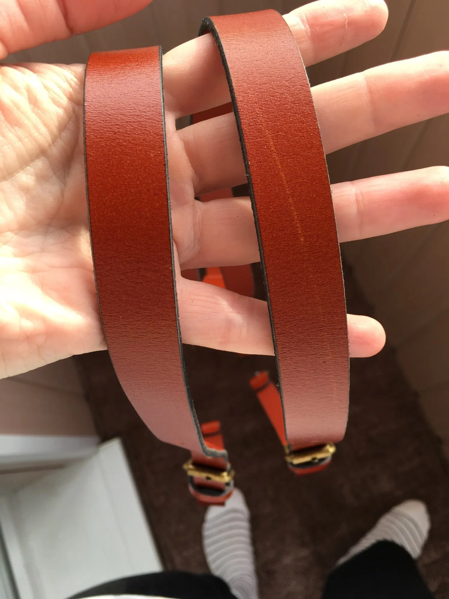 A mi parecer, producto en buen estado. Llegó en el rango de la fecha indicada por el proveedor. Se ven costuras en buen estado y en foto se aprecia una rugosidad del material, de unos 5 centímetros que va desapareciendo dentro de esa medida, solo en una de las tiras del lado de las uniones, pero al ojo humano se nota poco. No conozco de cueros, pero en color y diseño estoy satisfecho :)