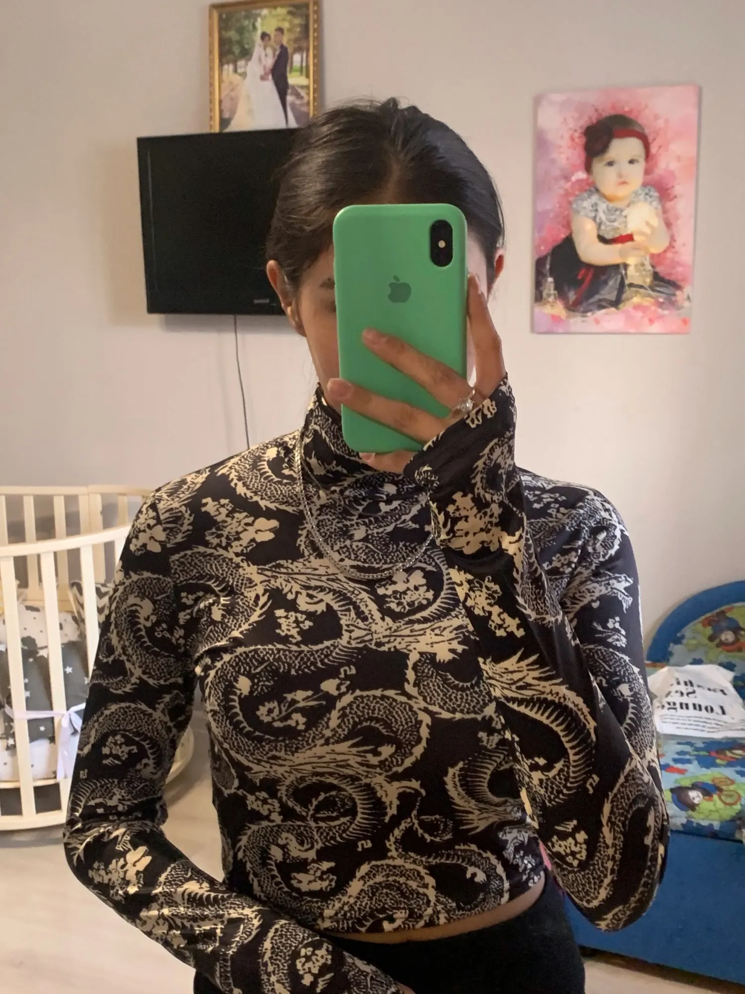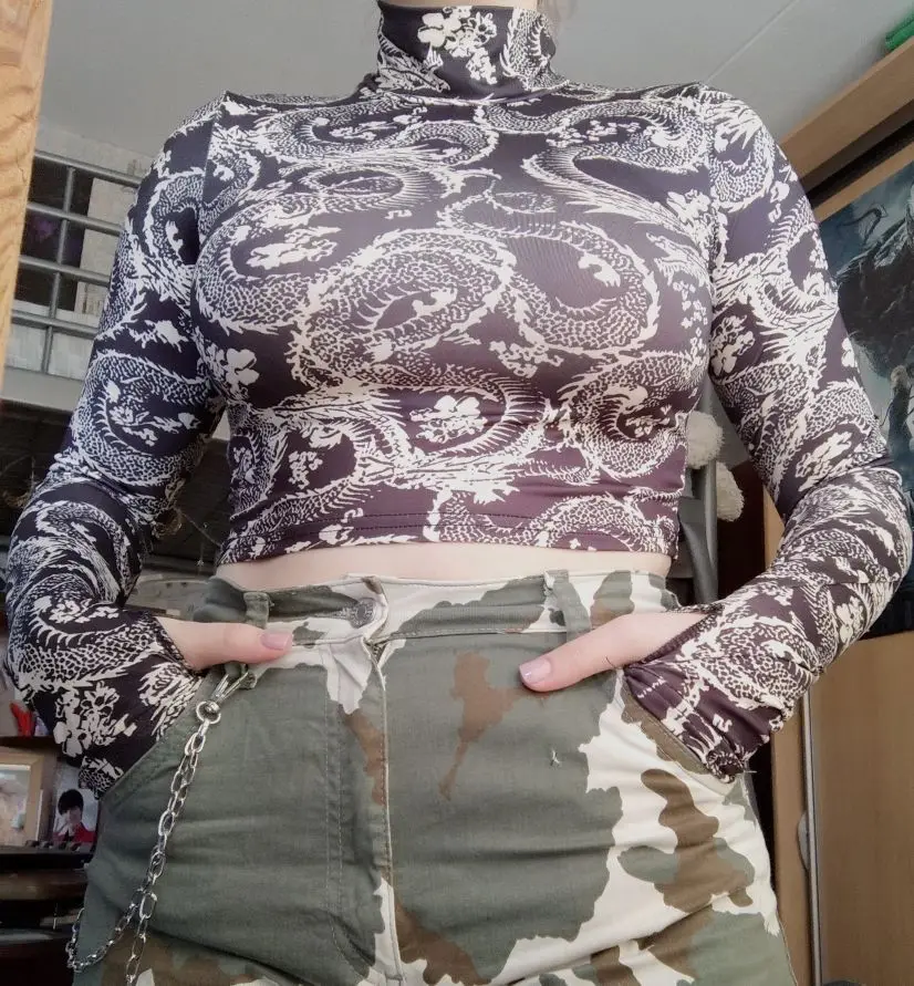 Tops cortos de dibujo de dragón para mujer, camiseta ajustada corta de manga larga con cuello alto para primavera y otoño