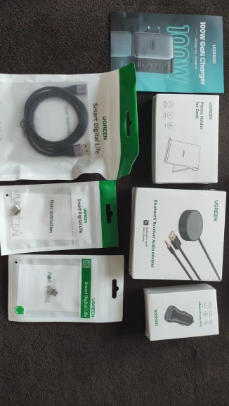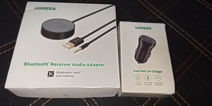UGREEN Bluetooth 5,0 Kit de coche APTX le receptor manos libres de 3,5mm Adaptador de Audio AUX Dual 4.8A del cargador del coche del USB 3M Base Clip de rejilla de ventilación