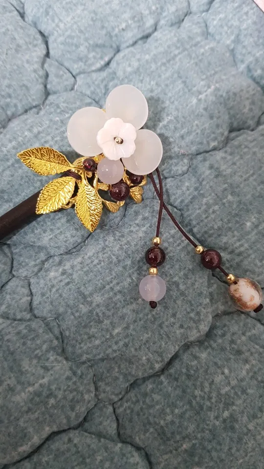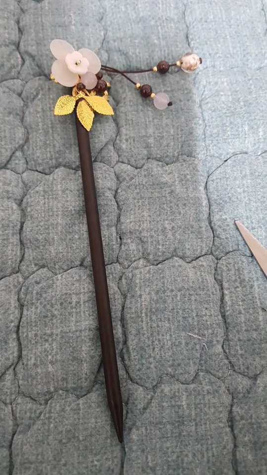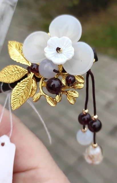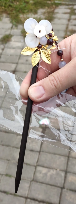 Hermoso accesorio, parece de buena calidad, el adorno esta sujetado por el mismo hilo de la decoración, no esta solo pegado, es ligeramente pesado, pero es ideal para un peinado.