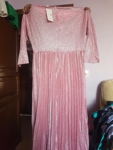 Esta preciosa llena de purpurina más bonita que en las fotos,el material esta más para primaver me encanta este vestido .el centurión un poco pequeño para le talla XL.