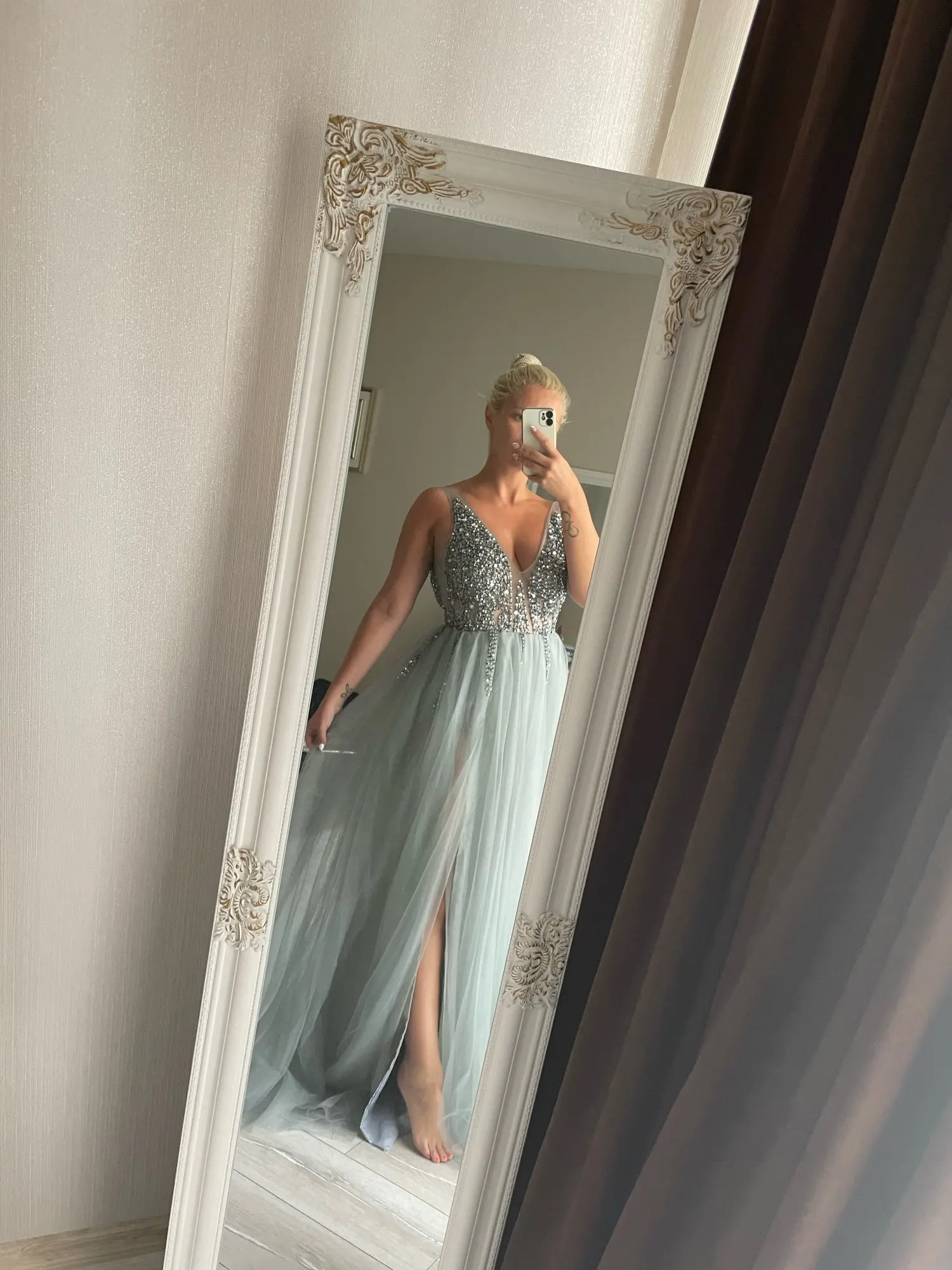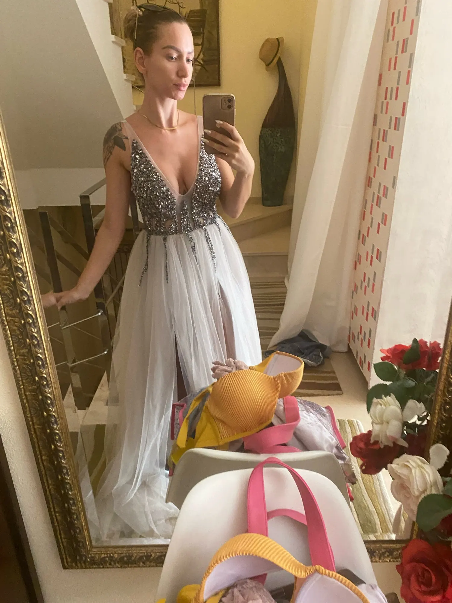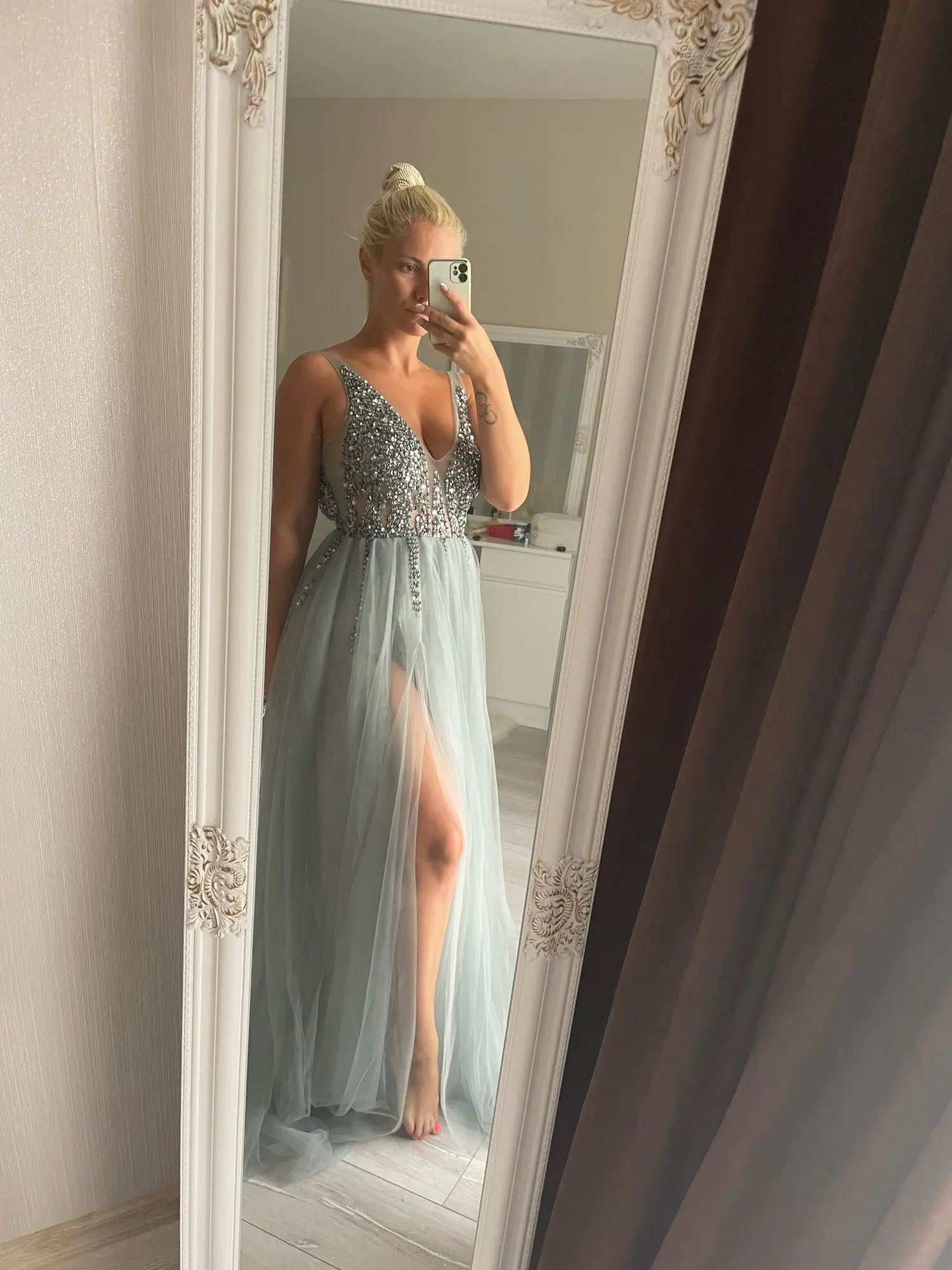 Vestidos De graduación con cuentas largo 2022 cuello en V gris claro alto Split tul Sweep Train sin mangas Vestido De noche Línea A Vestido De espalda descubierta