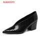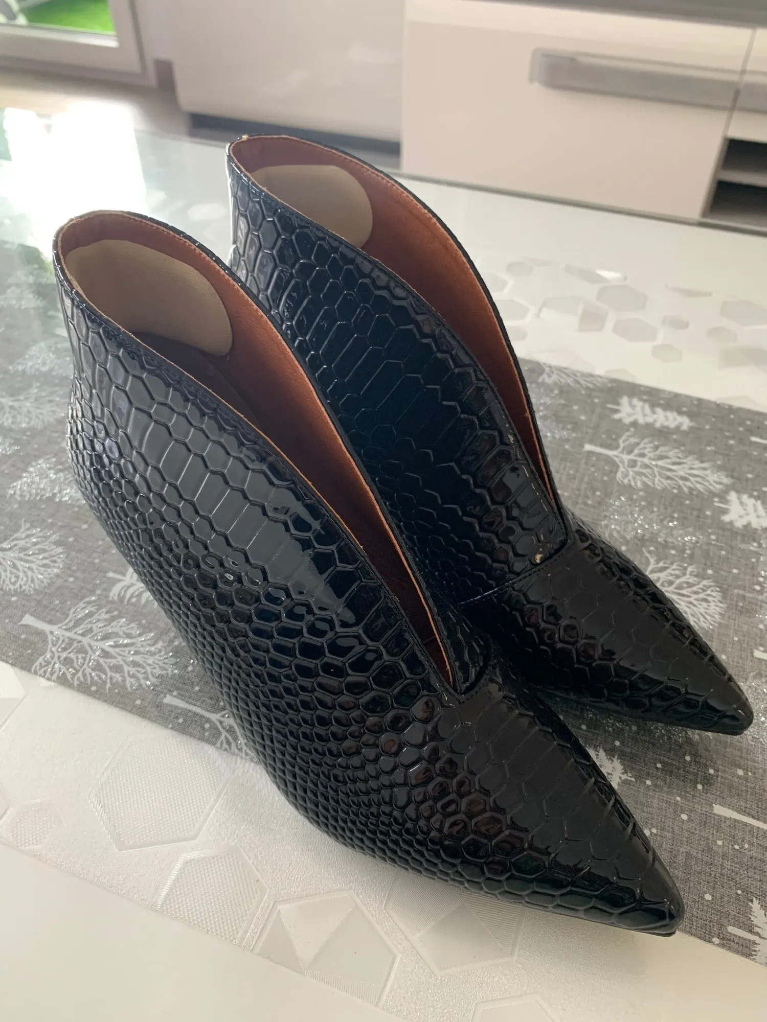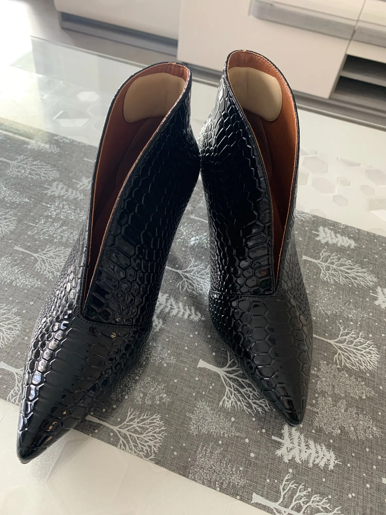 Zapatos de tacón alto y delgado con punta en V para mujer, Stilettos con punta en pico, de charol, serpiente, talla grande