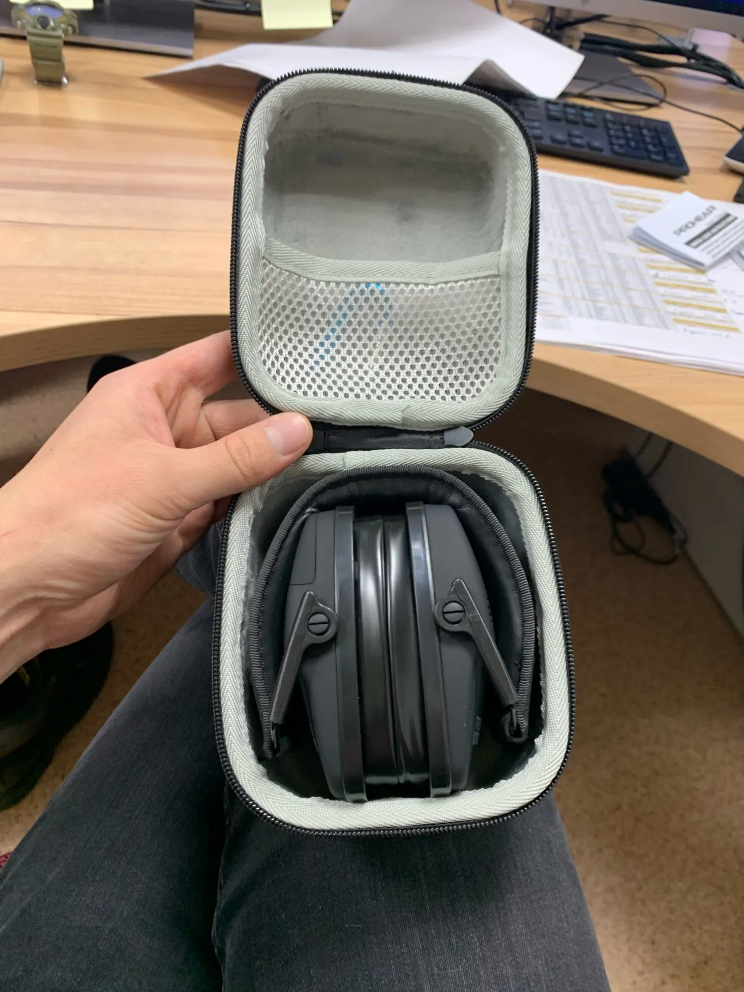 ha tardado pero el vendedor extendió la protección. viene con funda protectora, las almohadillas de gel, no de espuma, dan en un primer momento sensación de frescor, a falta de probar en galería de tiro por tiempo prolongado