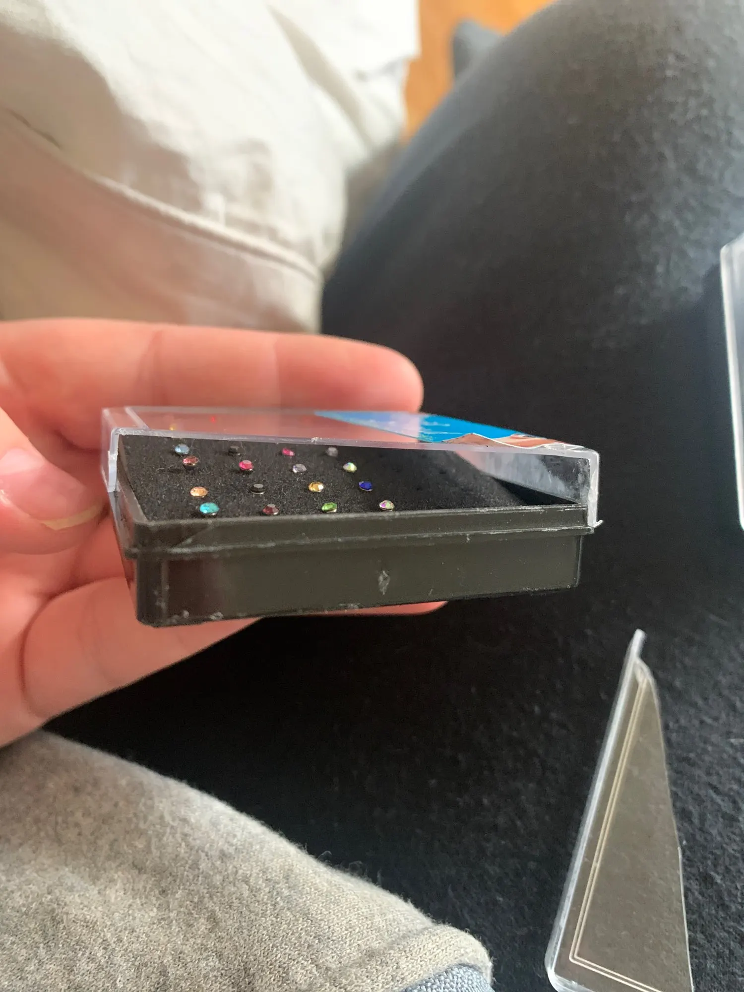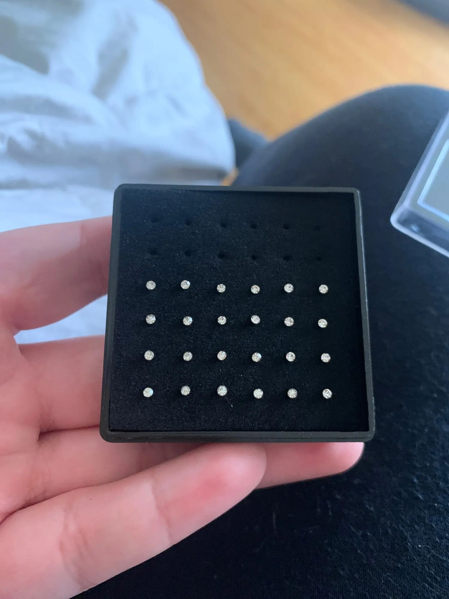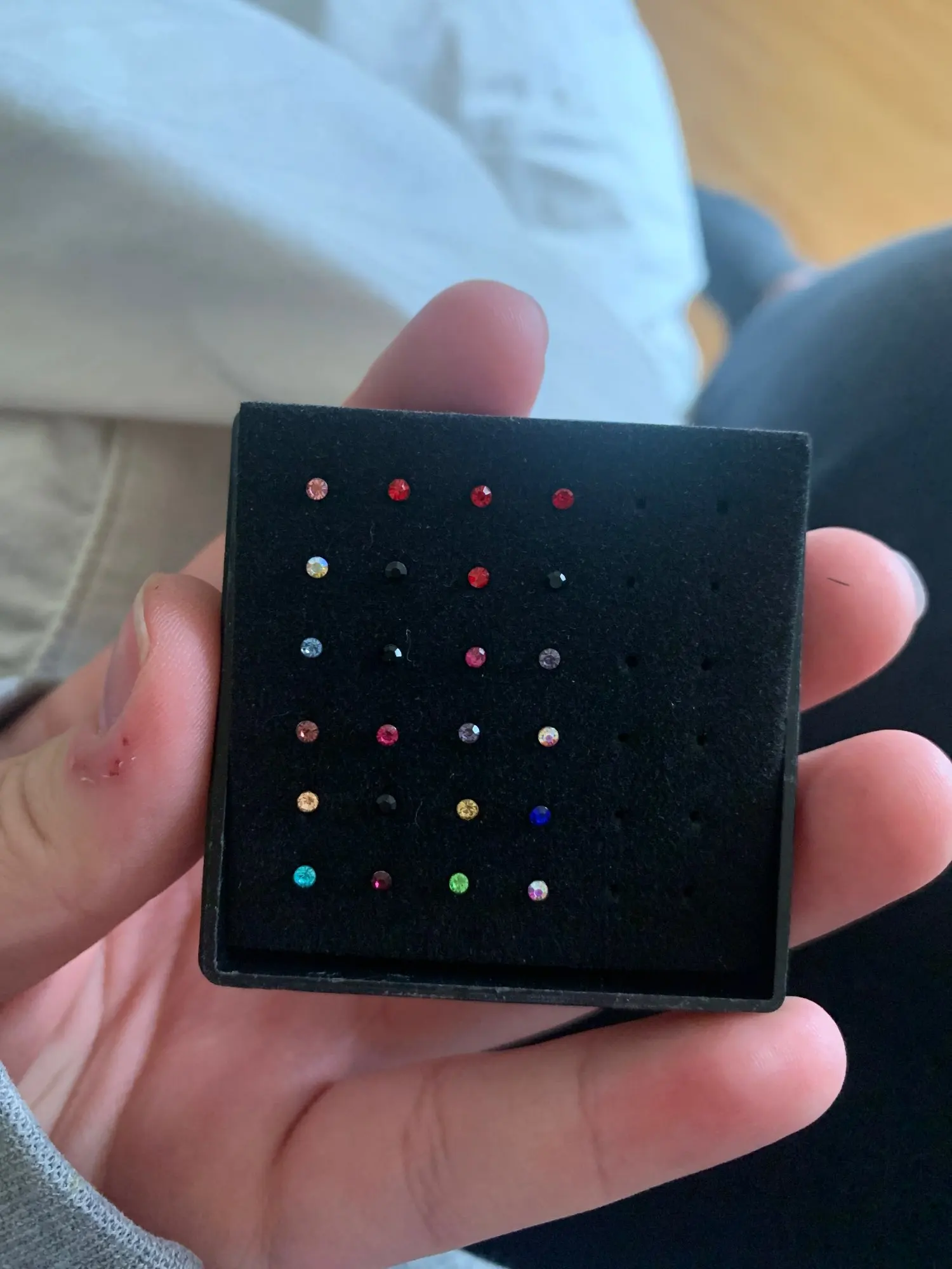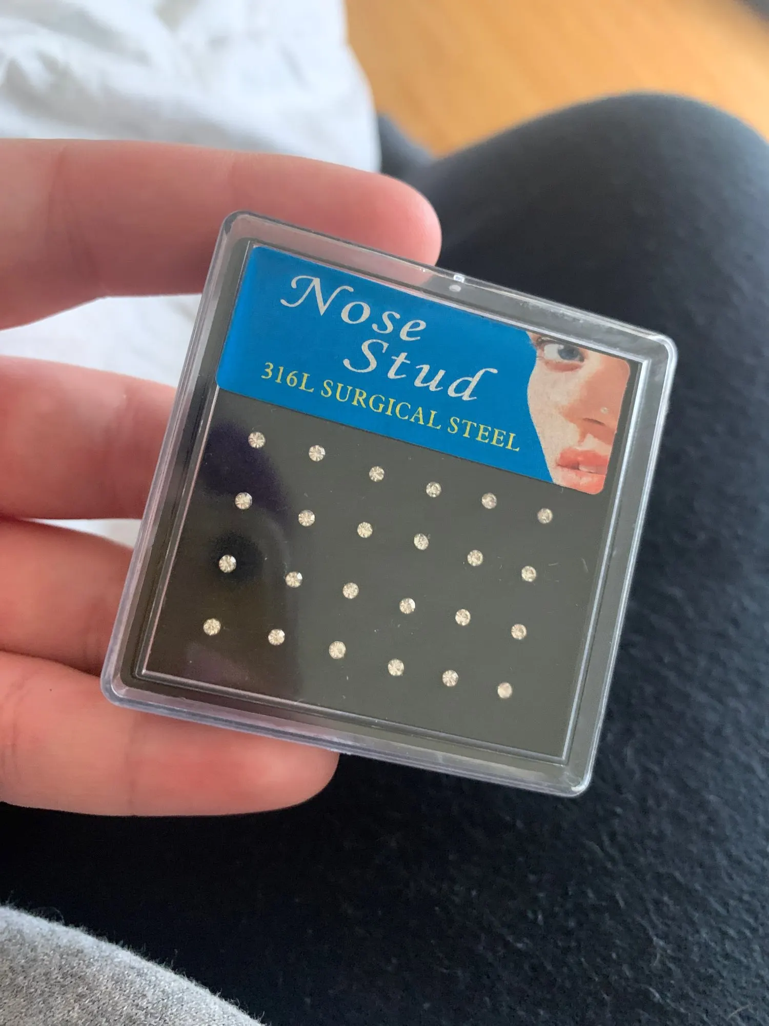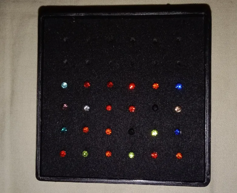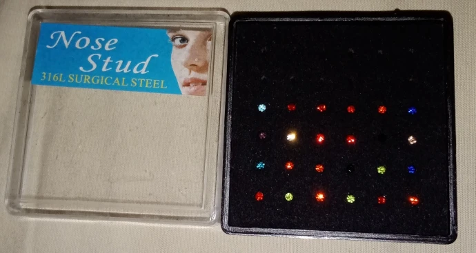 bien arrivé. idem que la photo. ce sont des tous petits clous pour le nez. jolis.livraison en 1 mois.