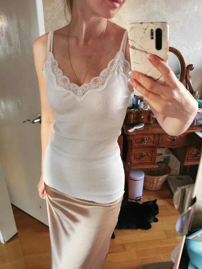 70% soie 30% coton tricot dentelle Camisole haut gilet vêtements de nuit Spaghetti sangle SJ309