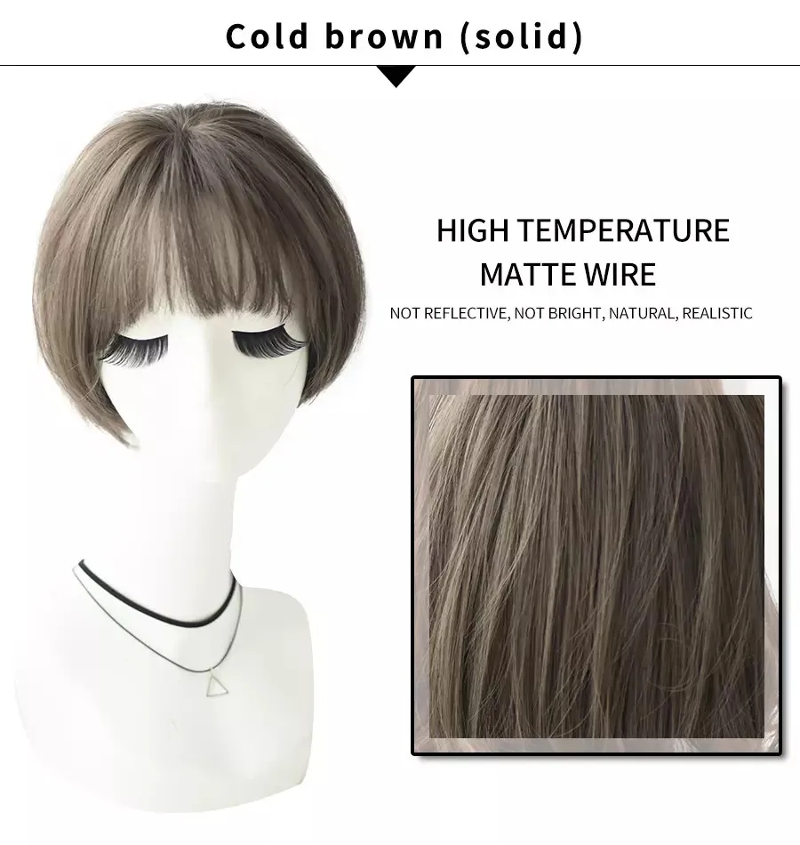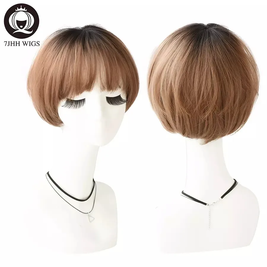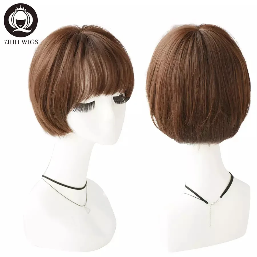 7JHH – perruque synthétique courte avec frange pour femmes, postiche Bob lisse, brune claire, douce et naturelle, à la mode