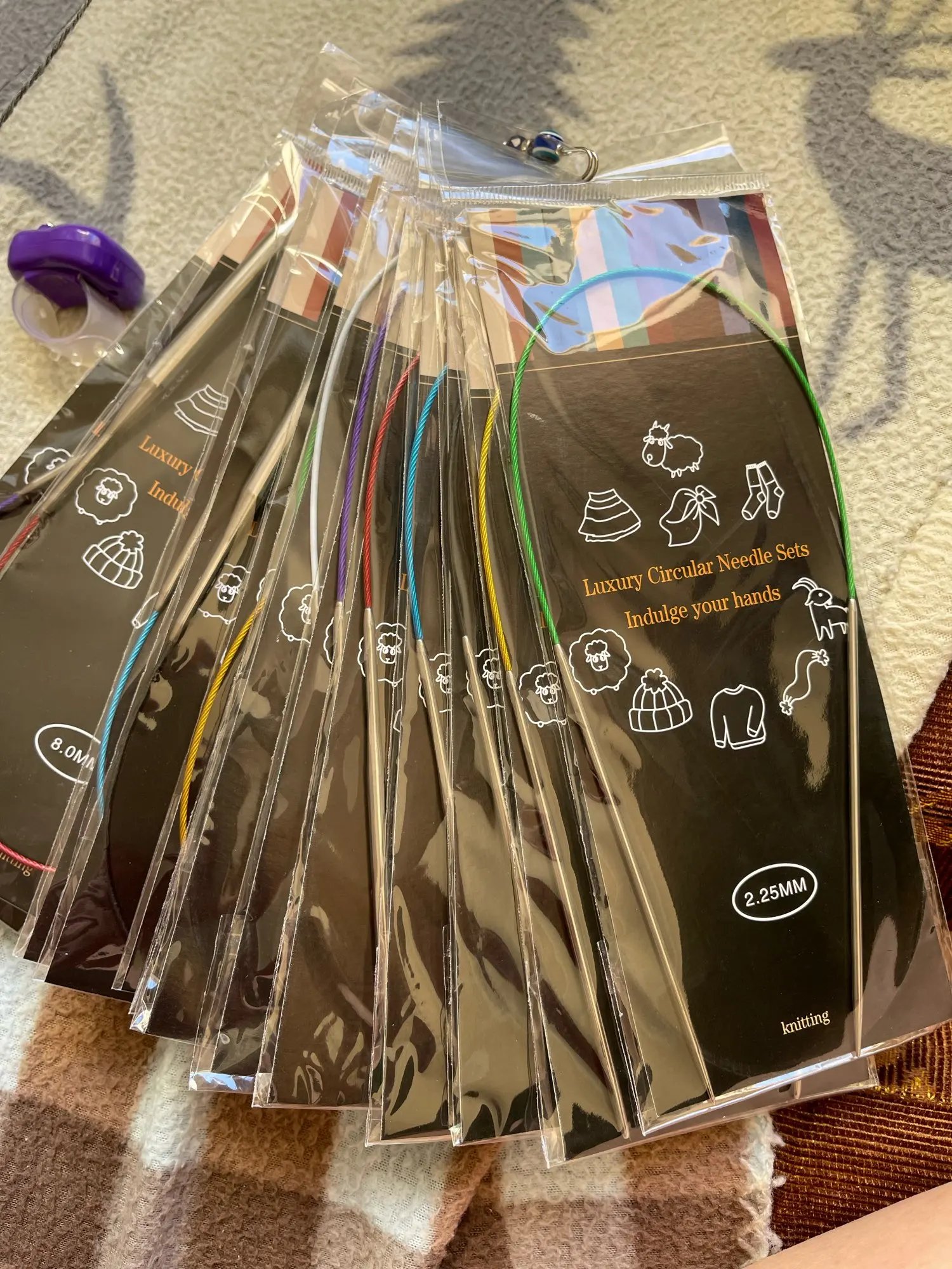 Produits conformes aux photos ! Très satisfaite de cet achat : - Pour le prix, et cela a l'air d'être de bonne qualité. - Pour les différentes tailles d'aiguilles. - Pour la livraison en seulement 9 jours ! Je suis par contre déçue de mon choix car j'ai pris en taille 100 cm. Il s'agit de la longueur totale "avec" les aiguilles et je pensais que c'était la longueur du câble. Pour précision si jamais, le câble et les aiguilles ne se détachent pas.