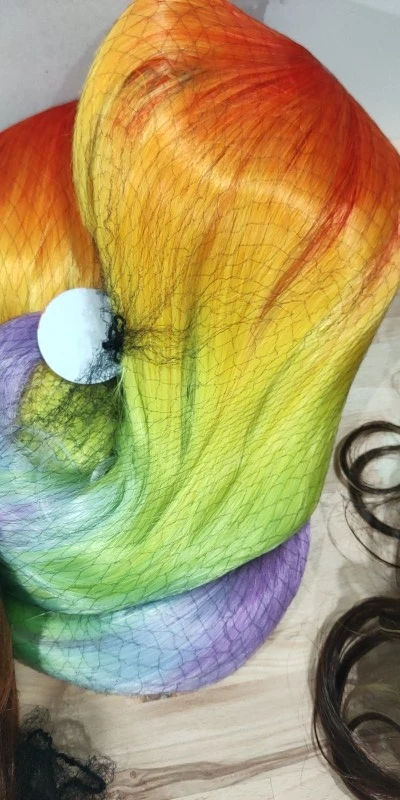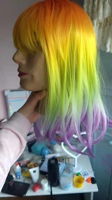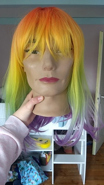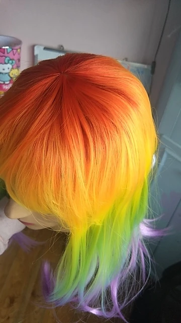 Perruque un tout petit trop brillante mais super jolie! Et puis bon pour le prix ça valait carrément le coup^^ Juste comme sur les photos et très jolies couleurs. Elle est arrivée très vite.