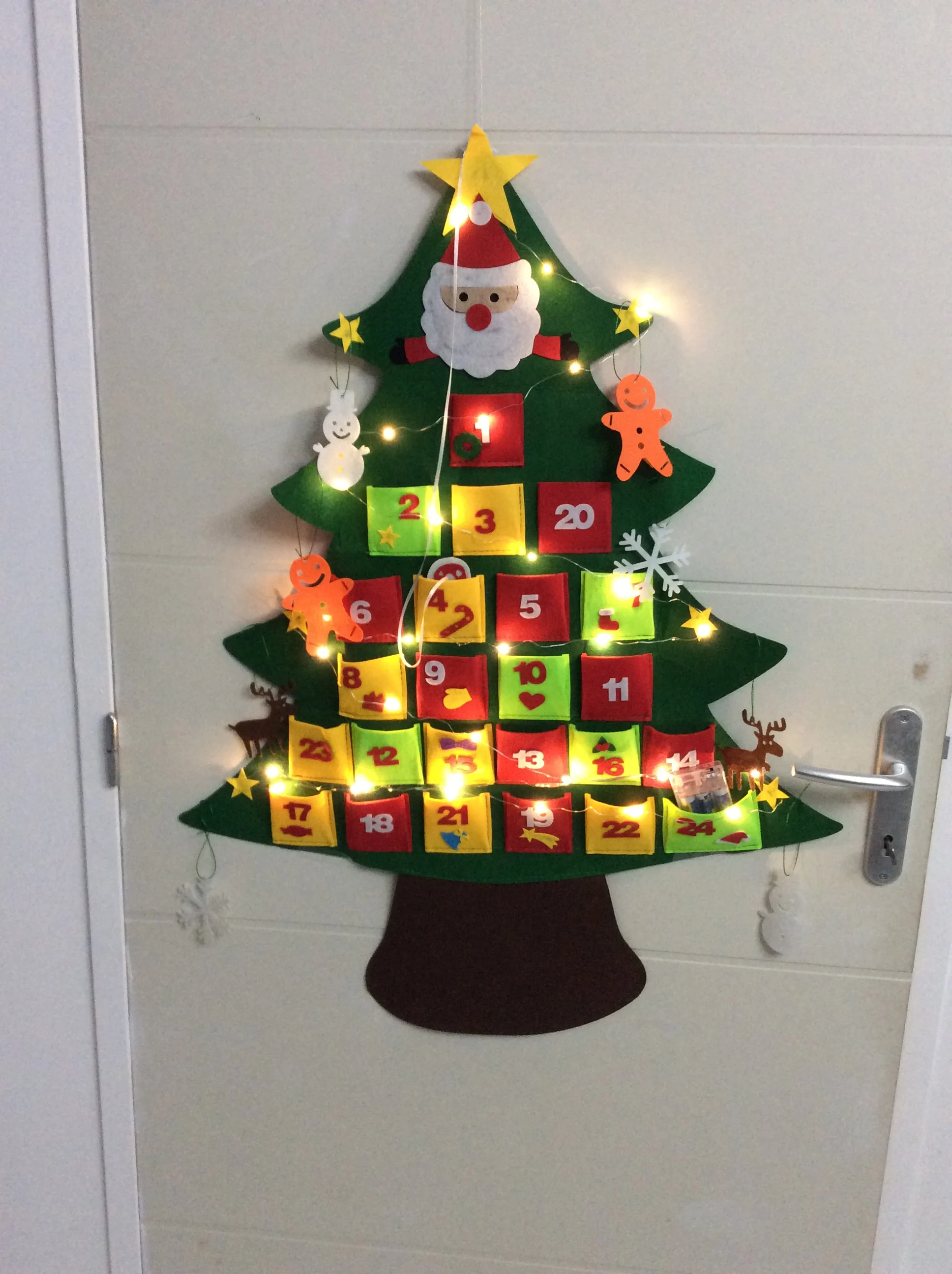 Commander le 11 livre le 4 soit un peu plus de 3 semaines. Mail d information le jour de la réception mais le suivi avant n est pas très précis Article d excellente qualité. Guirlande led très jolie ajouter trois piles Huit petites deco a associer à ce que vous voulez car le calendrier est déjà suffisamment décorer à lui seul. Pochette du 24 beaucoup plus grande. Un petit sucre d orge à déplacer en fonction du jour. Case suffisamment assez grande pour y caché plusieurs chocolat ou des petits jouets. Vraiment très heureuse de mon achat, va servir de longue année. En plus très grand il est très beau en deco dans la maison.