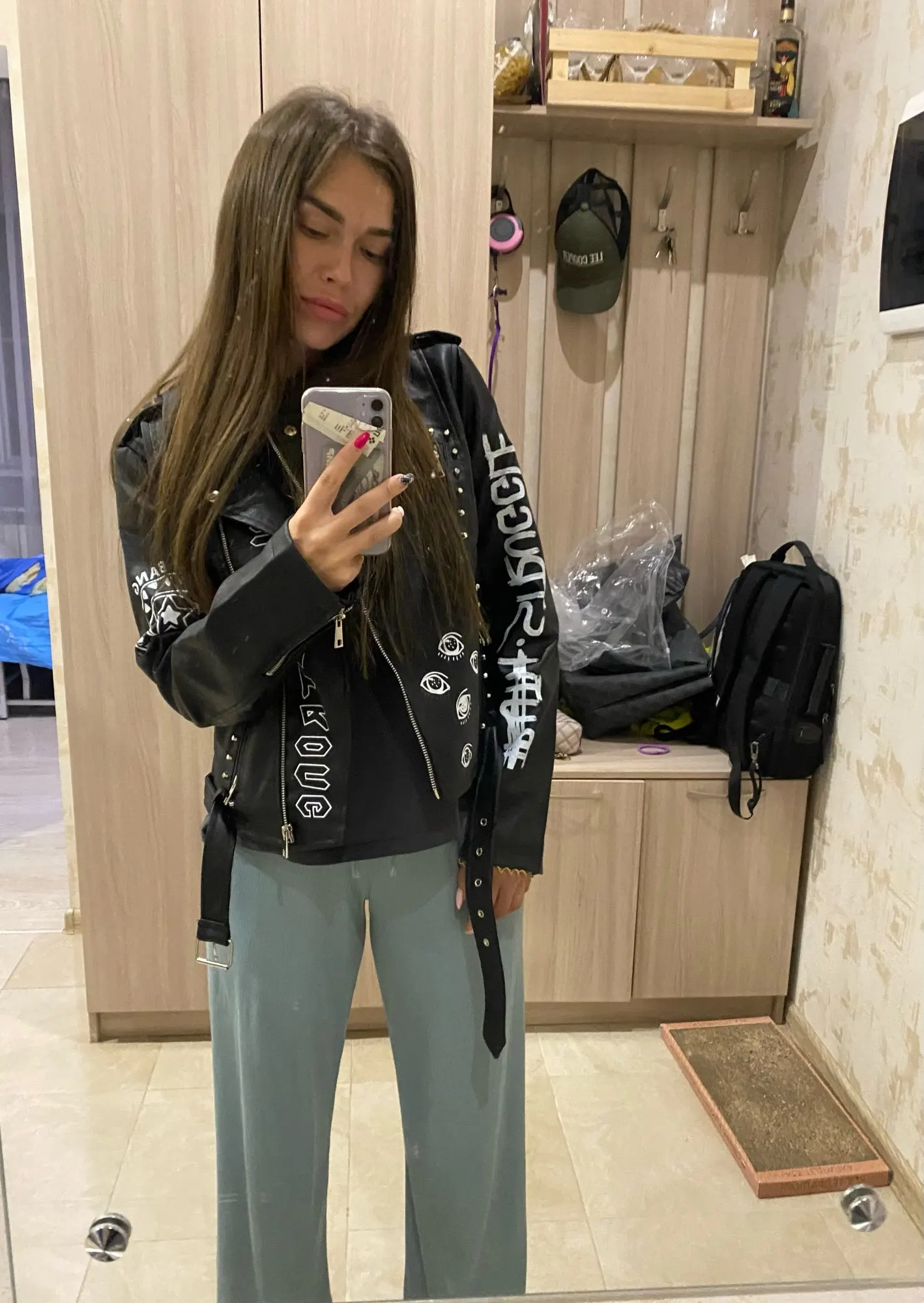 Blouson d'automne similicuir femme, de motard, lettres de Rivets imprimées, court, veste rock