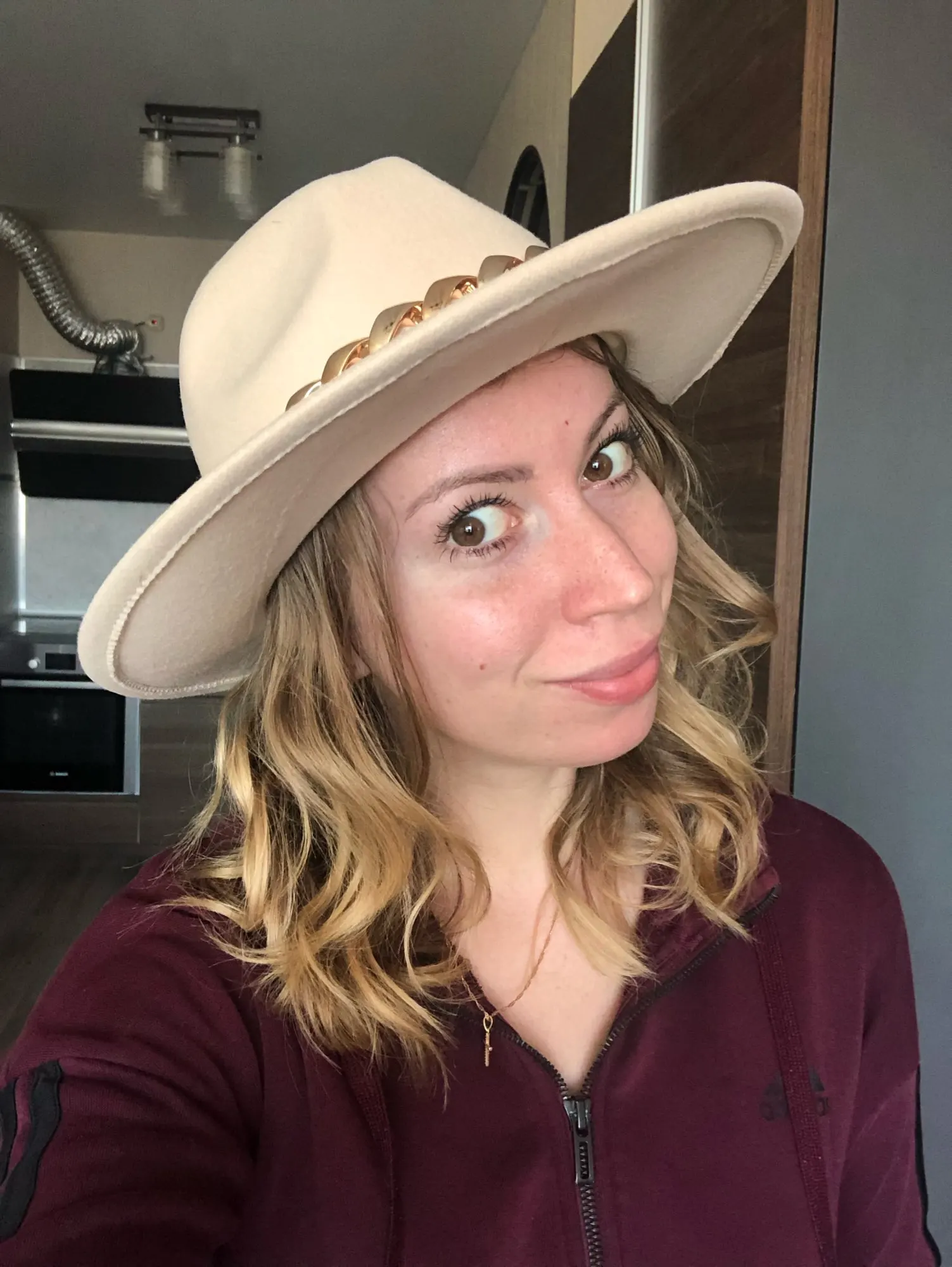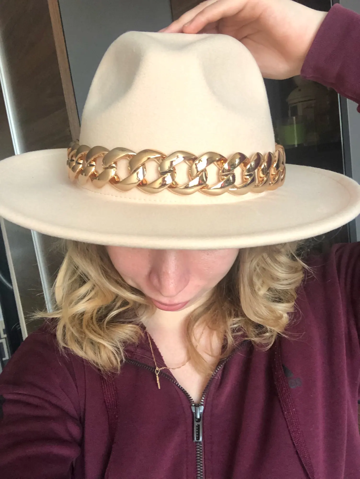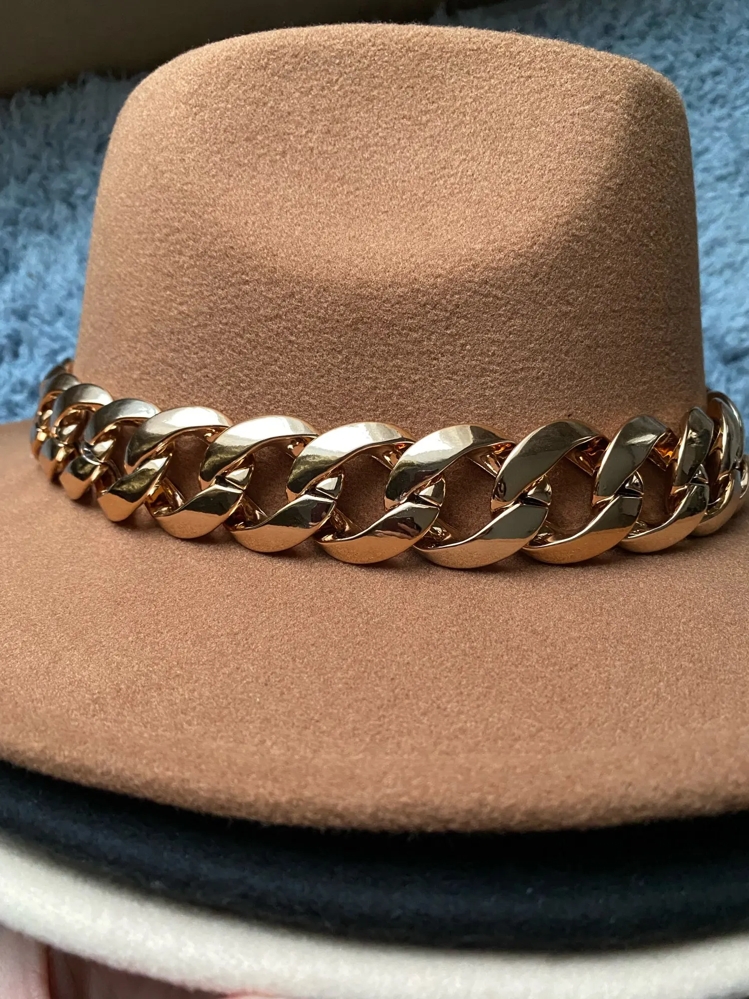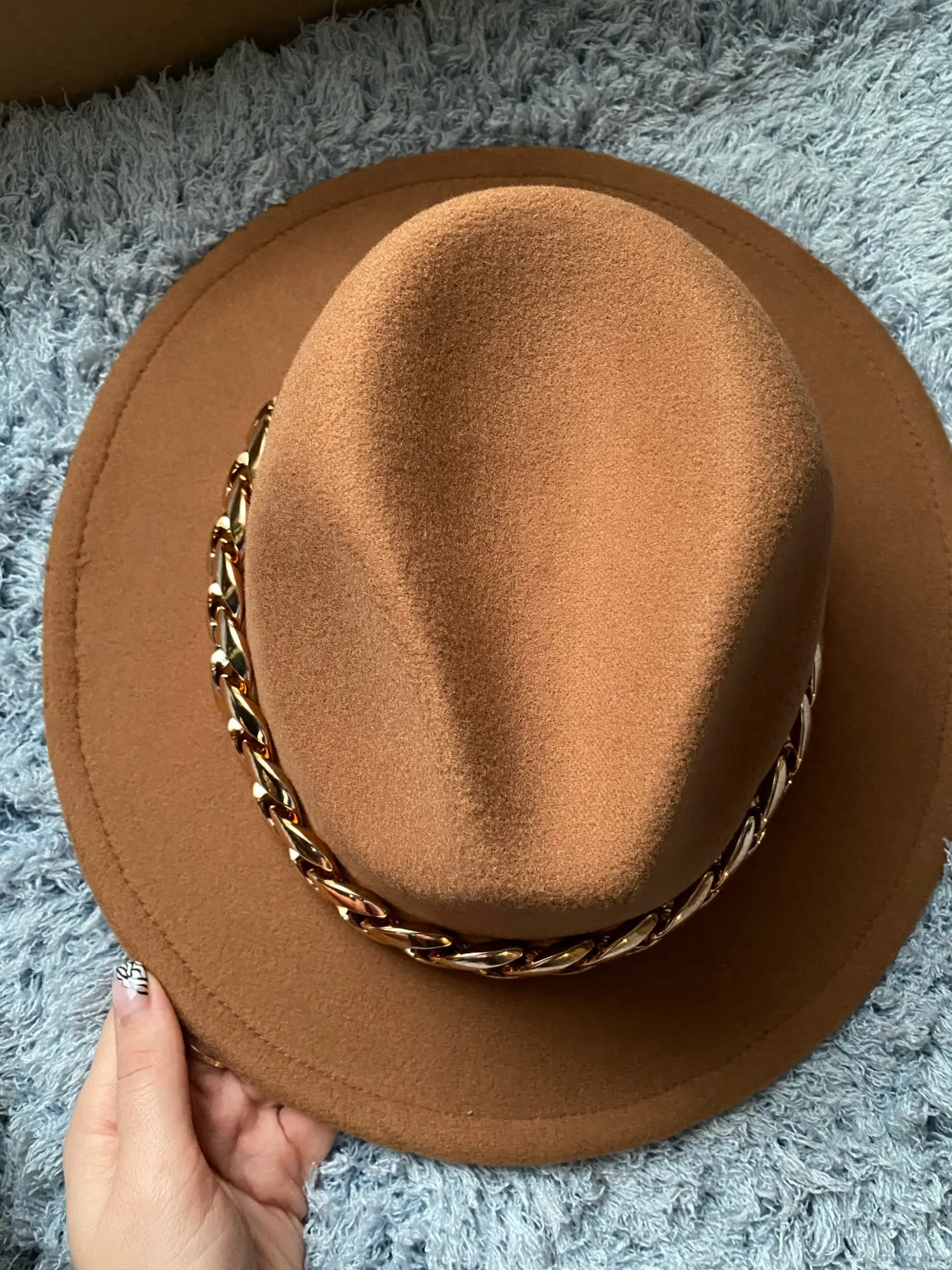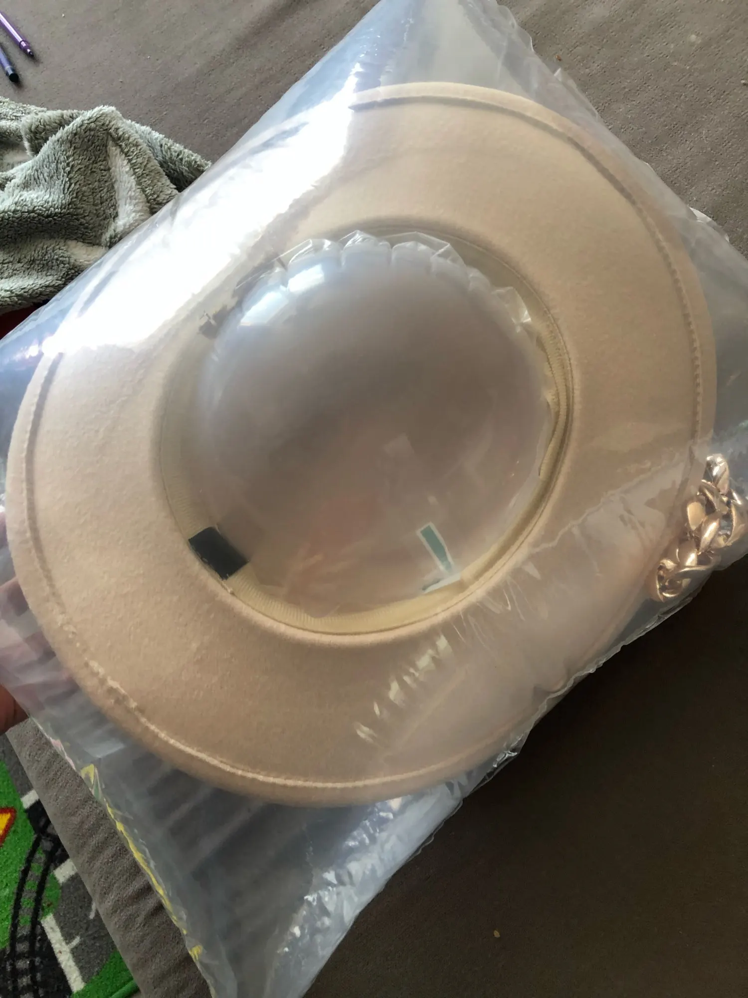 Chapeau trop grand, je regrette que plusieurs tailles ne soient pas proposées... heureusement une petite lanière de réglage est située à l’intérieur pour ajuster le serrage sur la tête, cela me permet de le porter même si une taille plus petite aurait été mieux. Livraison en 10 jours environ dans un SUPER emballage résistant et protecteur. Le chapeau est arrivé intact. La qualité du chapeau est très bonne. La chaîne est amovible.