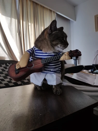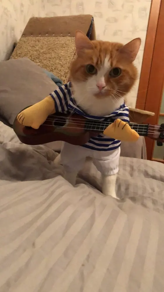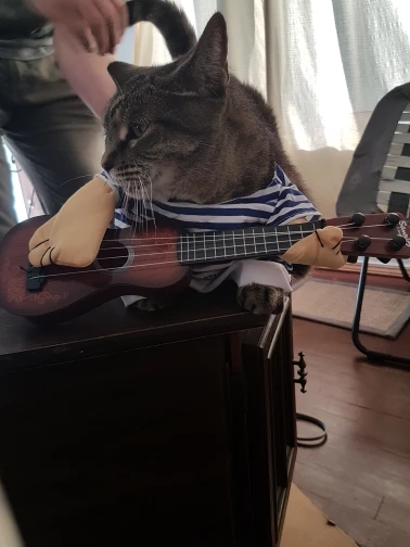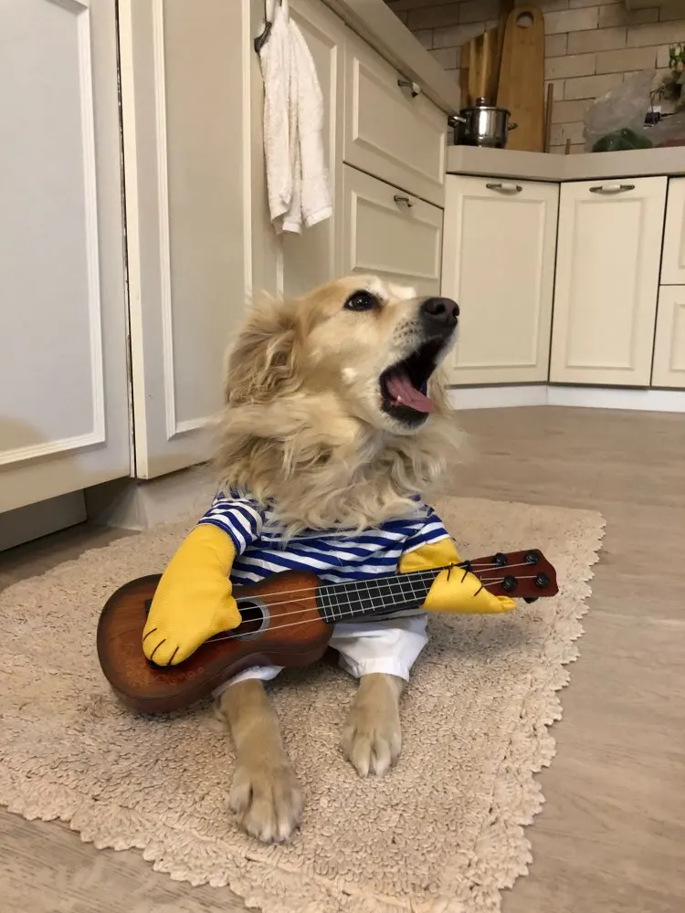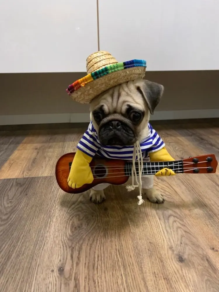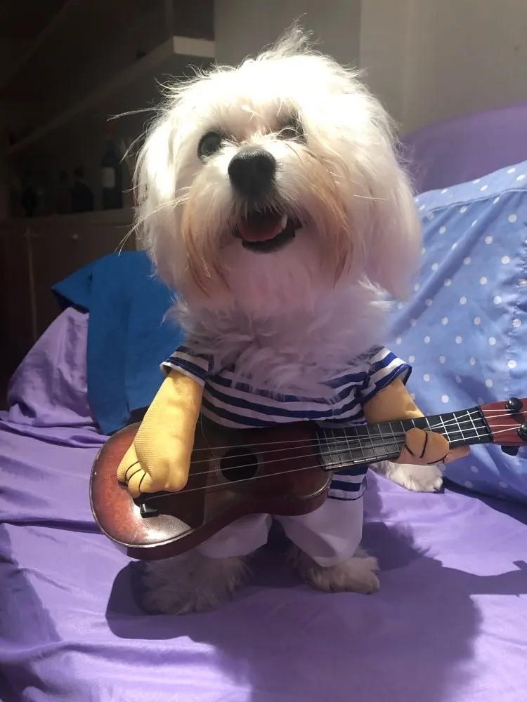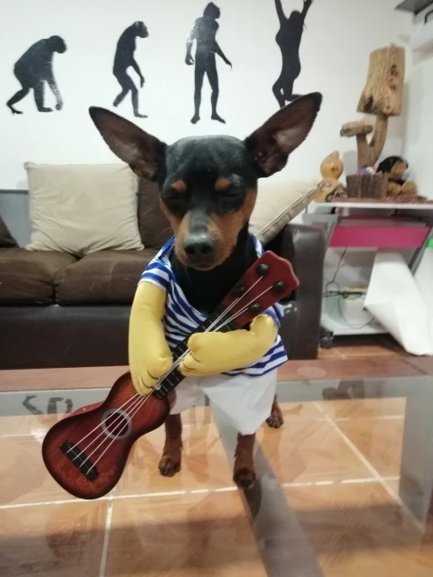 pas terrible ! pour un pinscher de 5 kg la taille M est impeccable ,par contre la guitare et beaucoup trop grosse elle traîne par terre ça me rend fou, je pense qu'il mette la même guitare pour toutes les tailles. nous avons enlevé guitare on lui mettra un petit ballon à la place, quant à la perruque que l'on voit sur la photo elle est absente pas de perruque noire. C'est un peu décevant.