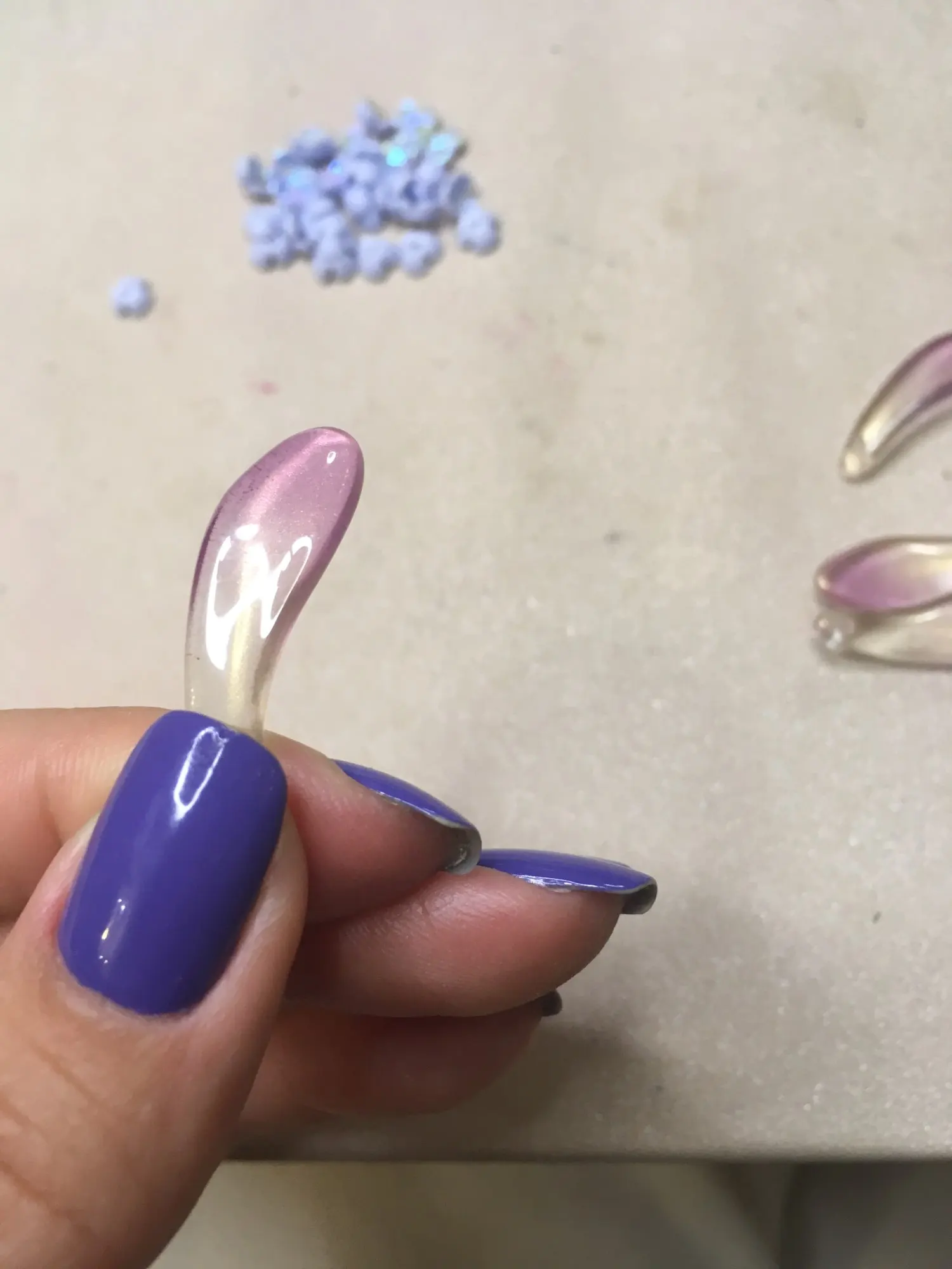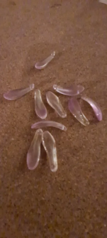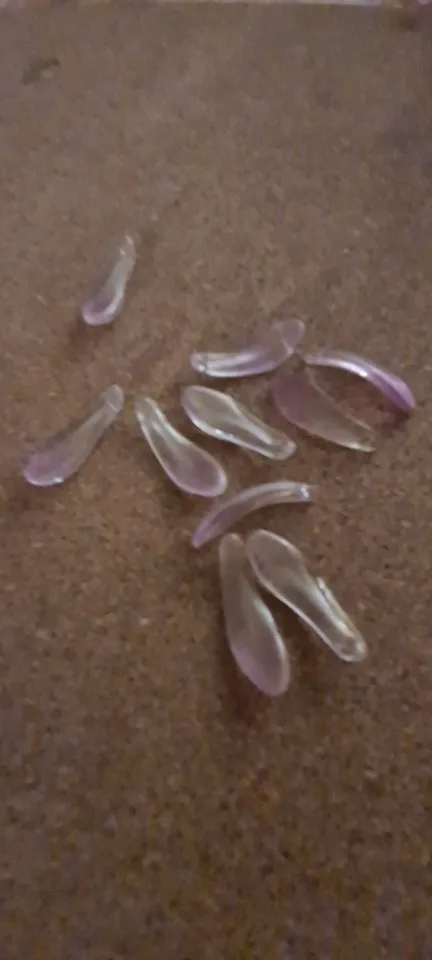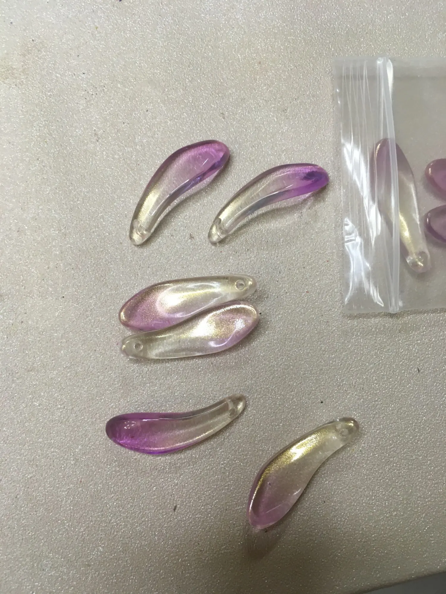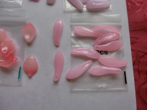 10 par paquet : oui. Taille de 27-28 x 8mm : oui. Épaisse de 2mm à la base et de 4mm à son maximum. Le trou est correcte. La couleur rose claire aussi. En verre : rien ne me laisse supposer le contraire. Je pense, en effet qu'elles sont bien en verre. Rapport qualité/prix convenable. Livraison sécurisée et rapide