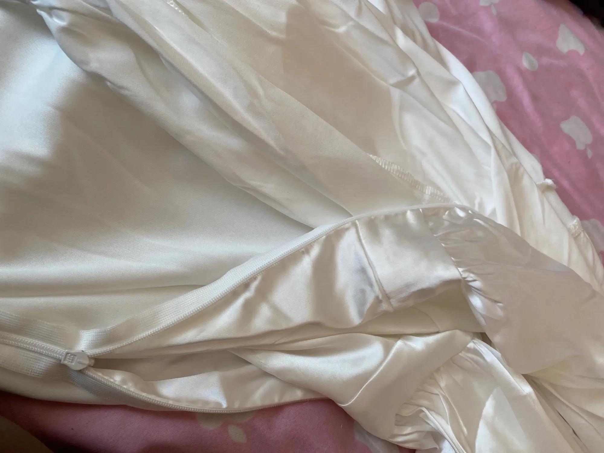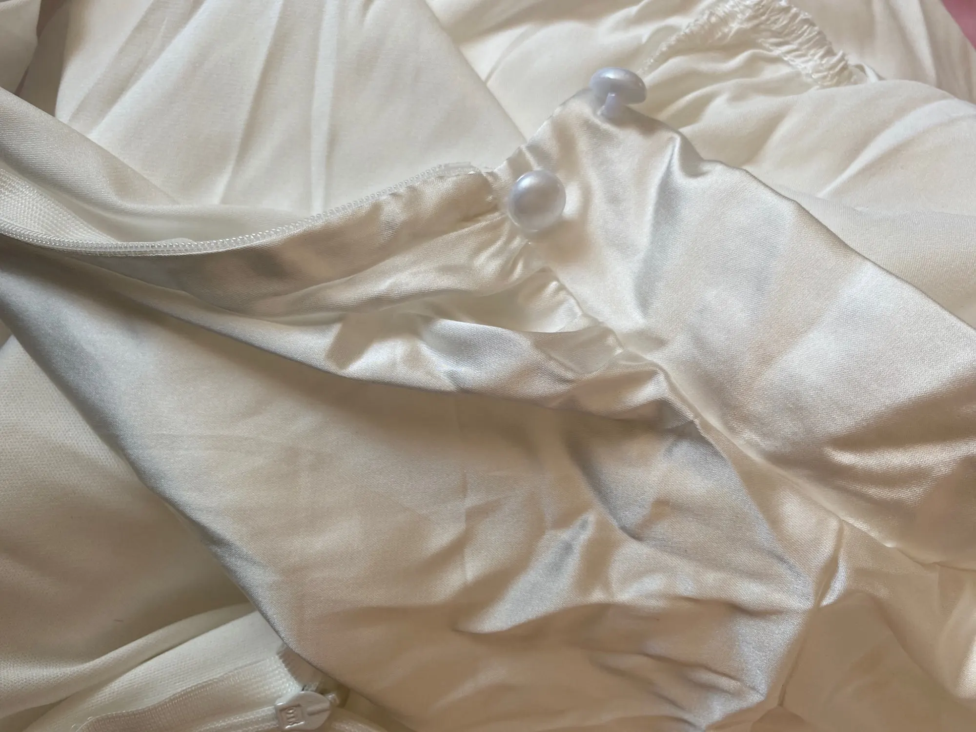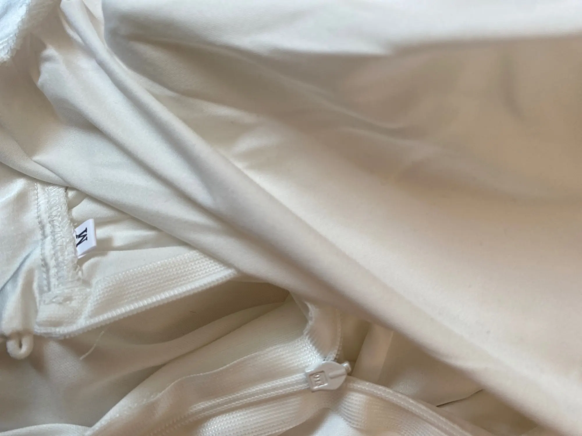 La taille est bonne, par contre la couleur n’est pas blanc cassée nacrée mais plutôt blanc nacrée donc un peu déçu car je m’attendais plutôt à une couleur blanc cassée/beige. Au niveau du buste légèrement transparent. Sinon je suis satisfaite merci !