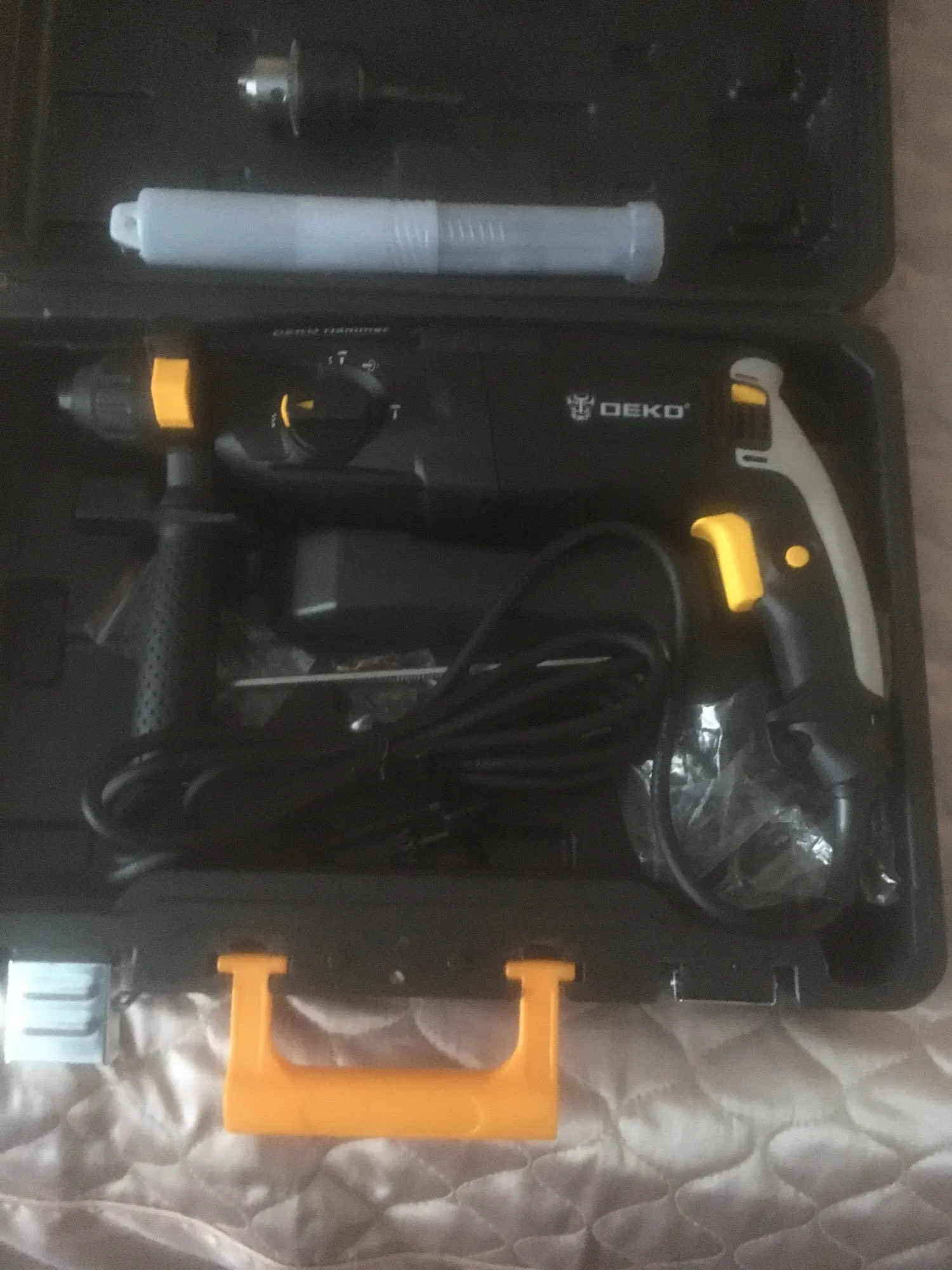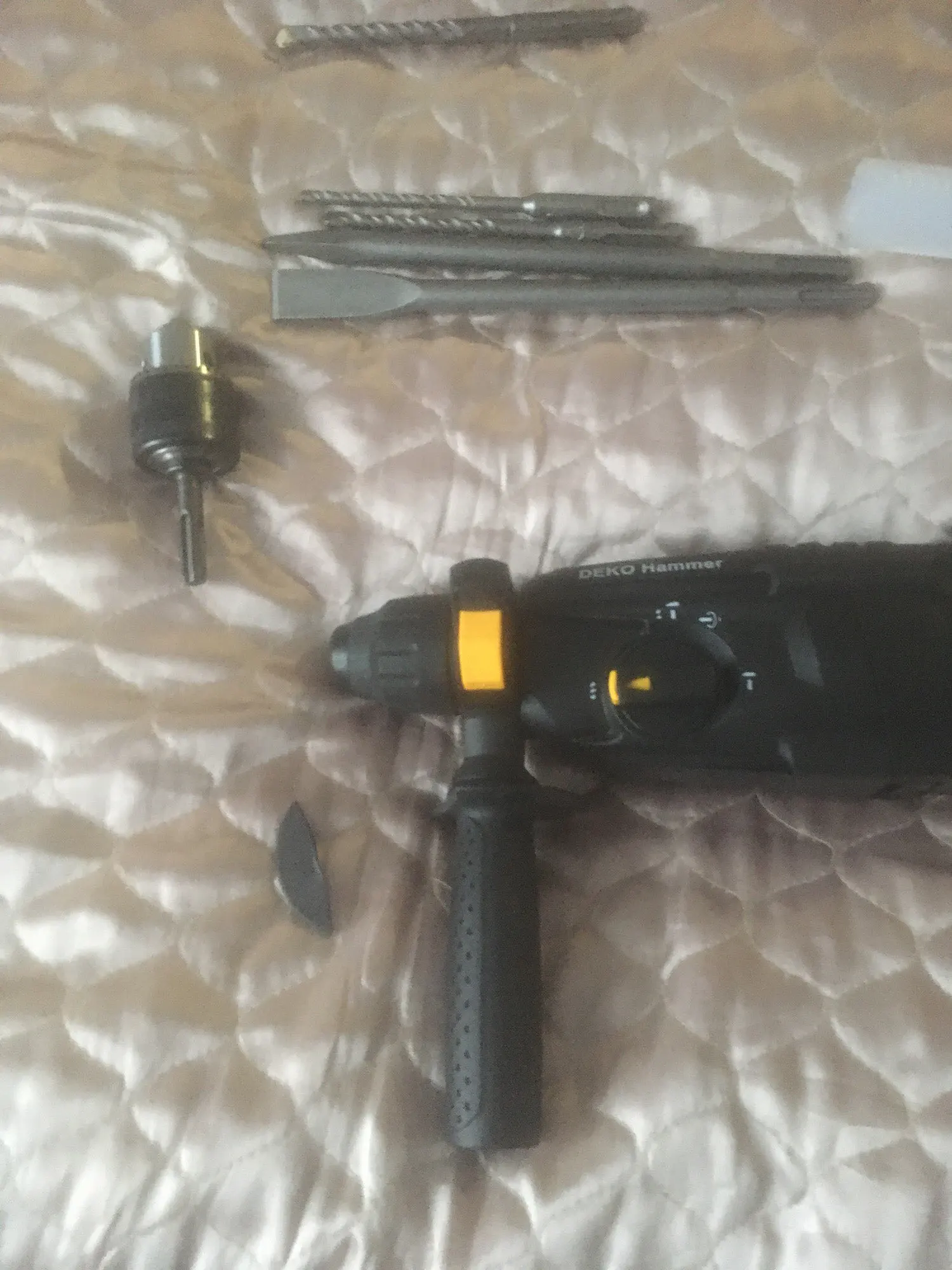 L'article reçu est bien conforme à la description y compris pour les forets qui sont bien inclus. Livrée dans une boîte assez qualitative. Le perforateur lui-même fait solide. Il est d'ailleurs plus que lourd que je n'imaginai. Je n'arrive pas par contre à insérer les forets SDS plus en faisant en sorte qu'ils se maintiennent bien. Dans la mesure où ce type de fixation est nouveau pour moi je laisse le bénéfice du doute et revisiterait le commentaire si nécessaire. ------------------------------------- The item received conforms to the description, including the drills which are all included. Delivered in a fairly qualitative box. The perforator itself looks well-made and is actually heavier than I would have thought. On the other hand, I cannot insert the SDS plus drills while making them hold tight. Since this type of fixation is new to me I leave the benefit of the doubt and will revisit the comment if necessary.