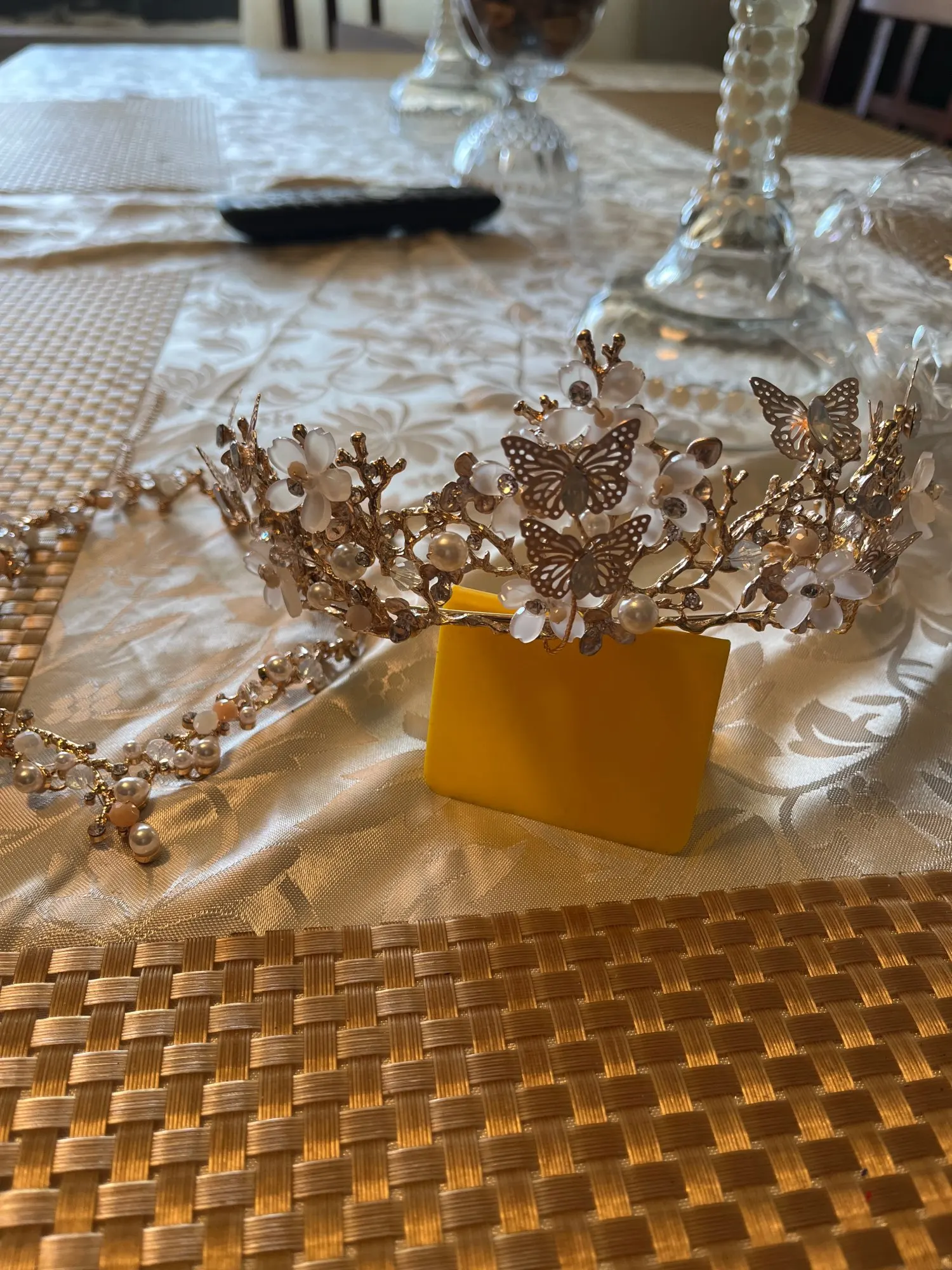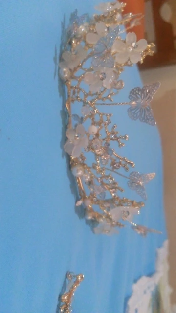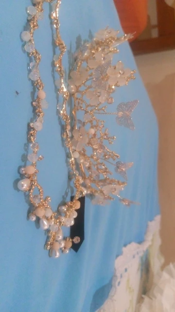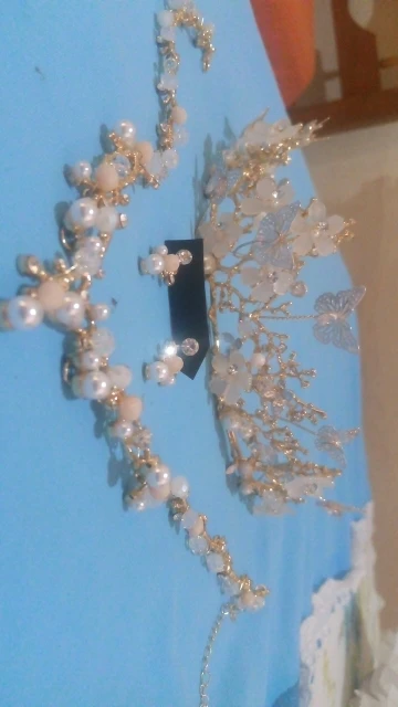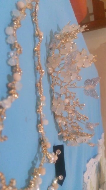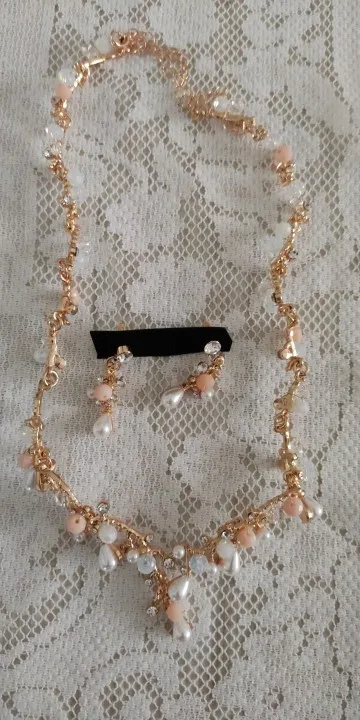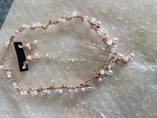 Perles blanches, bleues et roses clair. Métal doré. Une peu lourd. Reçu en moins de 2 semaines. Qualité moyenne. Mieux en photo