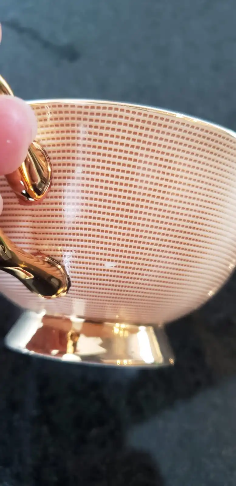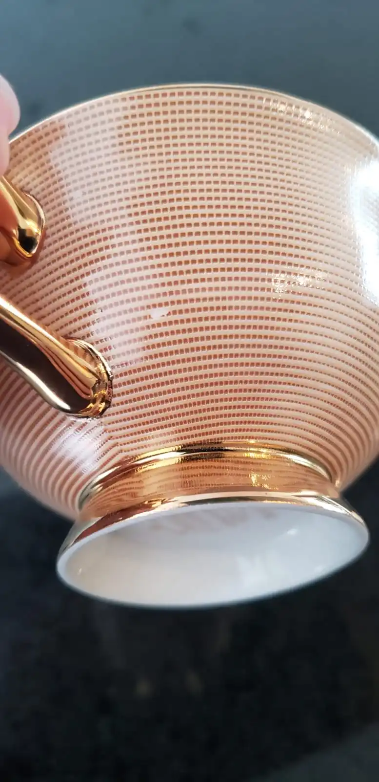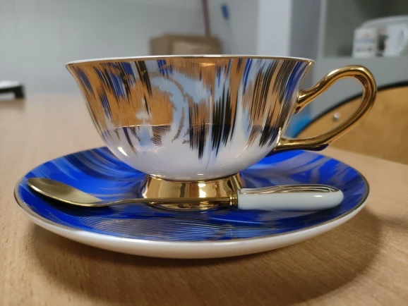 Jolie tasse, au rendu pas tape à l'œil, classe ! fine porcelaine assez légère je suis satisfaite. Poids de la tasse 130g soucoupe 149g. Colis arrivé rapidement à peine 3 semaines, protégé par un emballage en polystyrène heureusement ! Le colis a soufert lors du trajet le carton était déchiré malgré la mention fragile appliquée par le vendeur