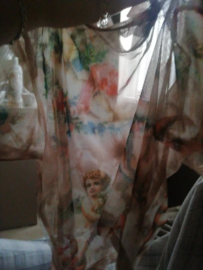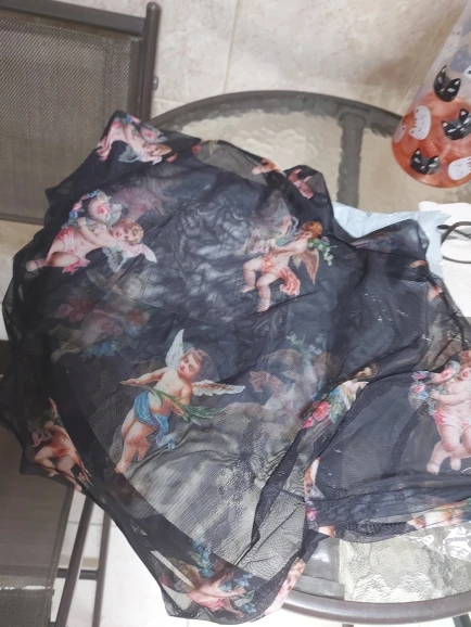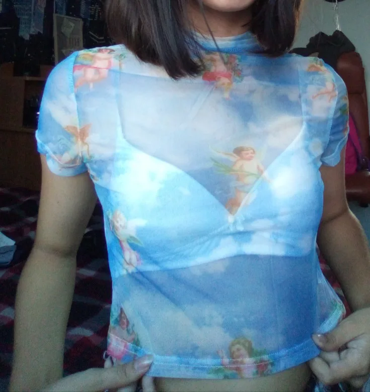 Femmes été à manches courtes col roulé haut court drôle coloré ange cupidon imprimé T-Shirt évider pure maille Net Streetwear