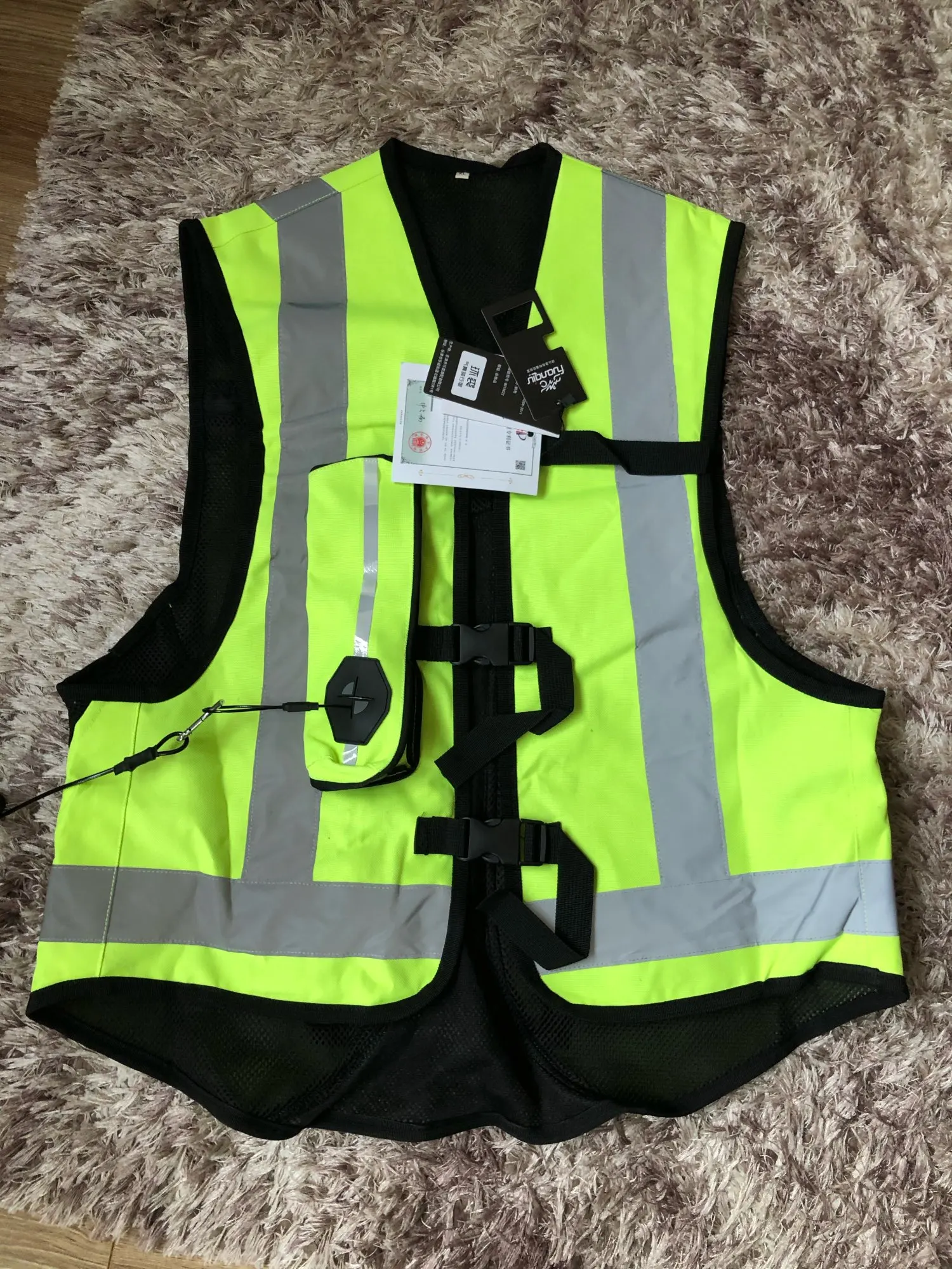 gilet conforme a sa description. taille S se met par dessus la combinaison et je ne suis pas serrée. le cordon est suffisamment long pour pouvoir se bouger tranquillement. les cartouches se mettent facilement. que du + et de la sécurité ppur un petit prix.
