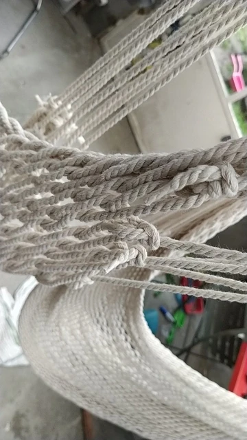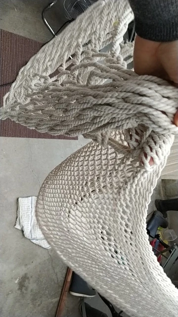 Ce modèle est une deuxième commande. Un jour de promotion j'ai voulu bénéficier d'un deuxième hamac moins chère que le premier. A la réception, j'ai été très déçu car en fait il s'agissait du modèle à grosses mailles moins bien, moins confortable... finalement ce n'était pas une promo mais juste un autre modèle. En photo, les deux hamacs, à maille fine et l'autre à maille large.