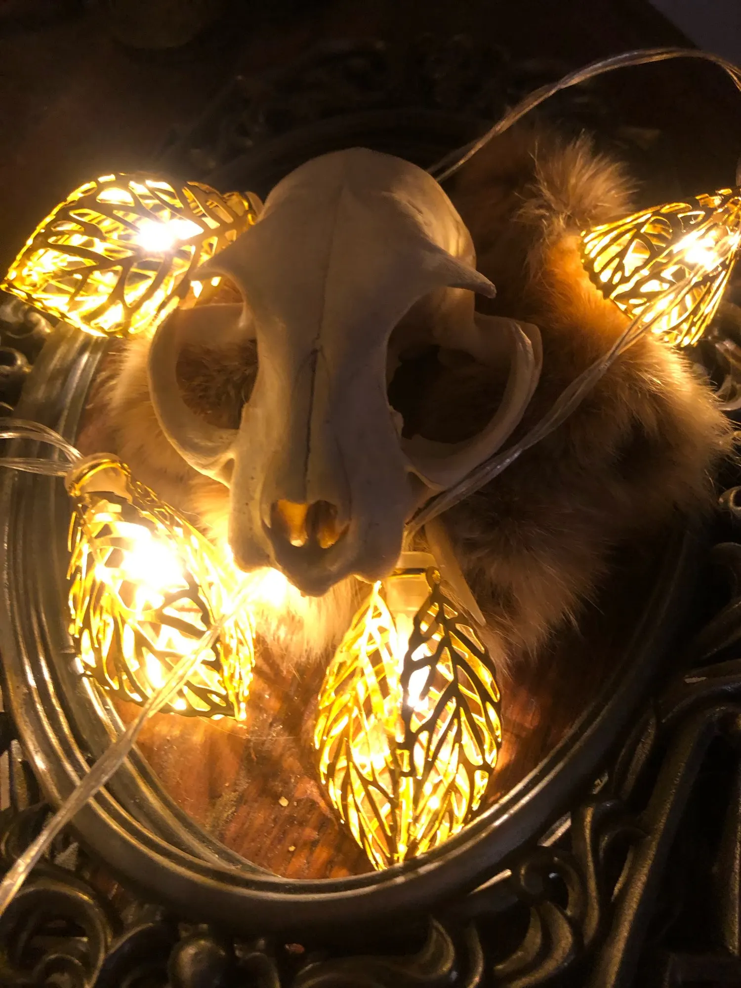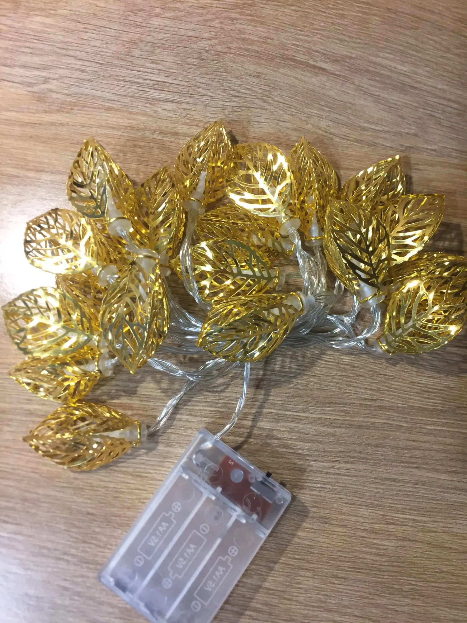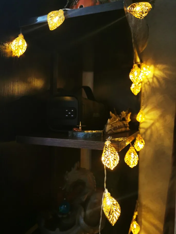 belle guirlande de 10 ampoules led. la forme 3D représente une feuille de couleur cuivre du plus bel effet. je trouve cette guirlande particulièrement réussie. j'ai caché le boîtier piles (2 AA ou LR6) sous les pierres.